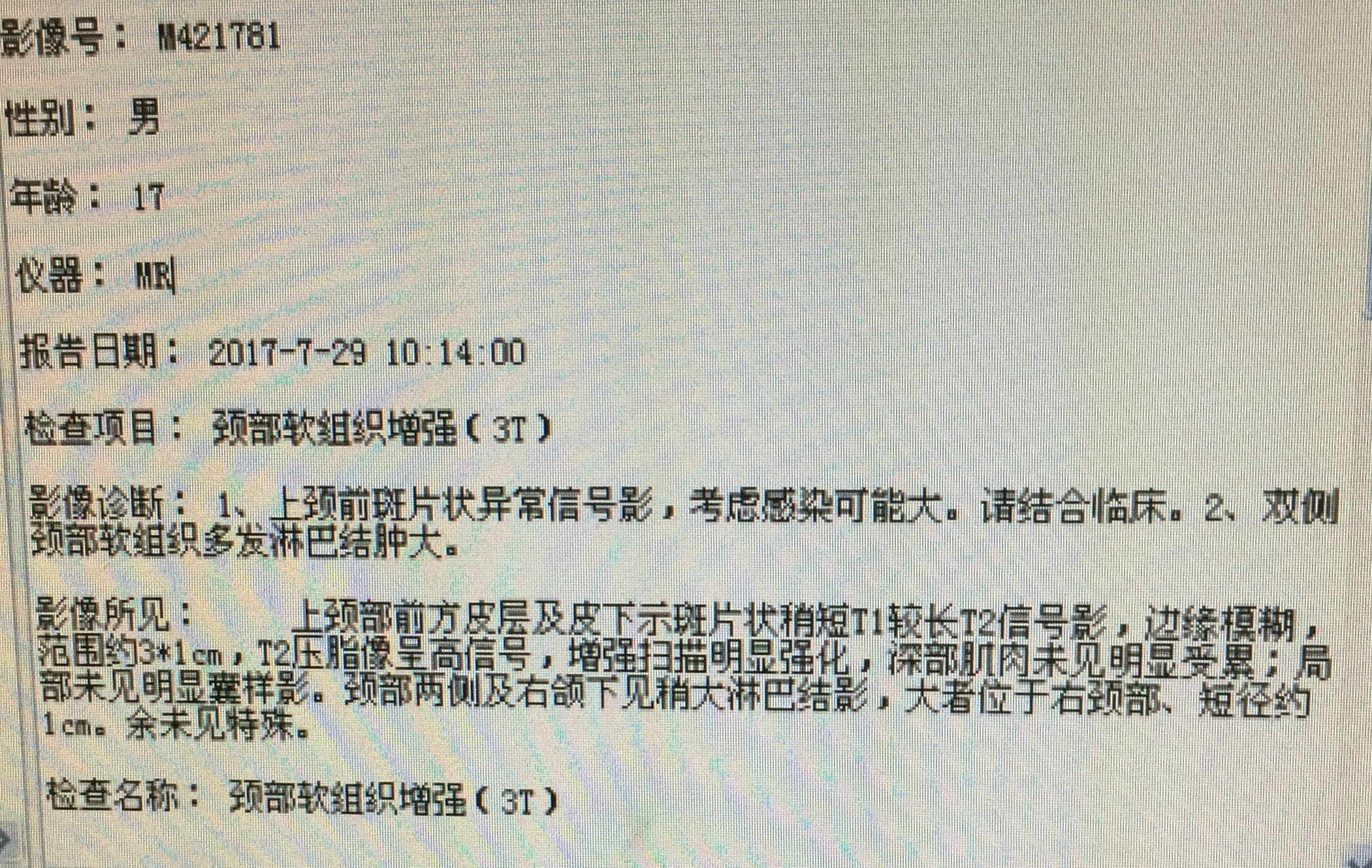 查体:颈部正中颏下可触及质硬肿物,大小4*2*3cm,肿物破溃,皮肤红肿,可触及波动感,活动,与周围组织无粘连。