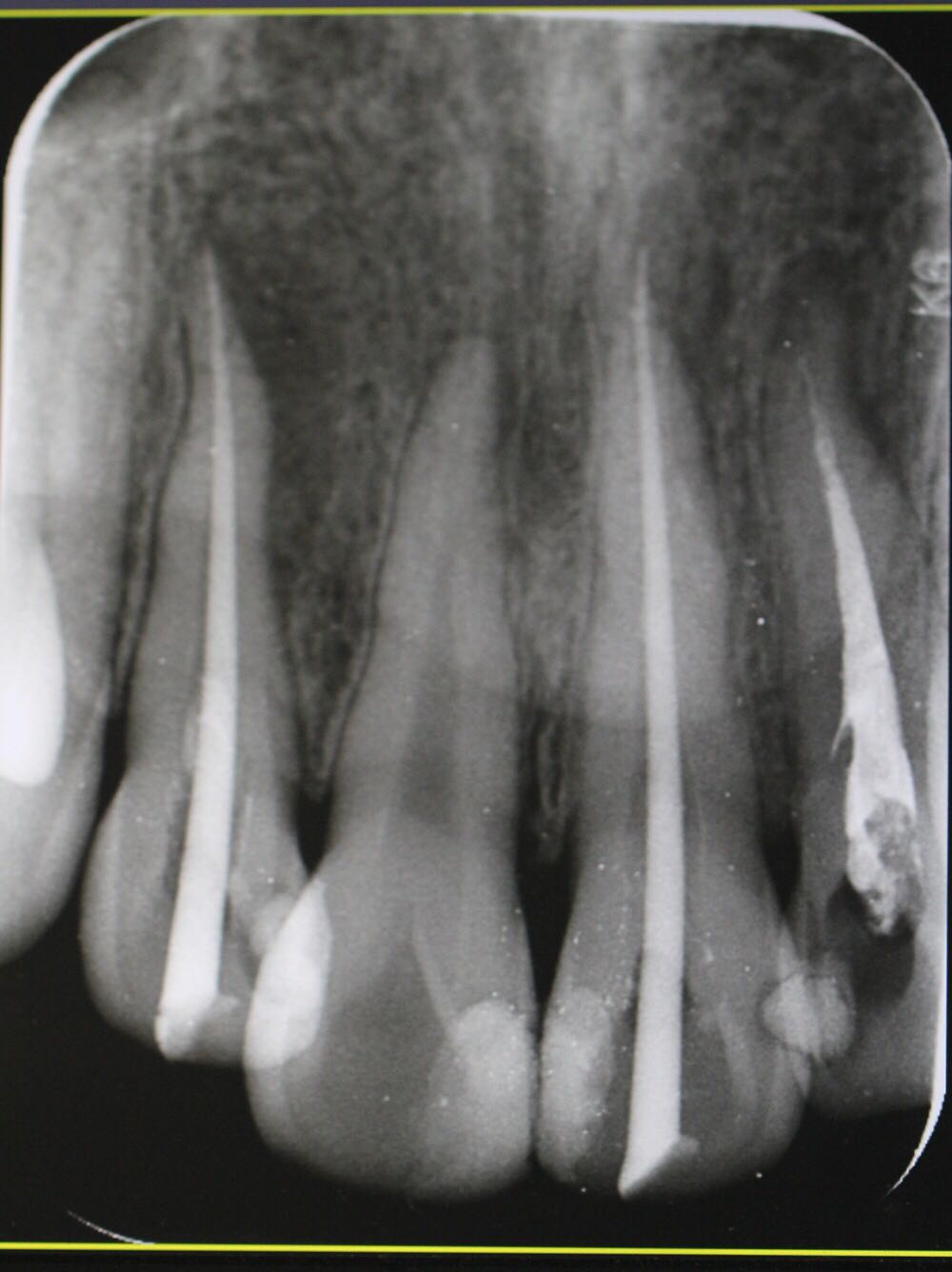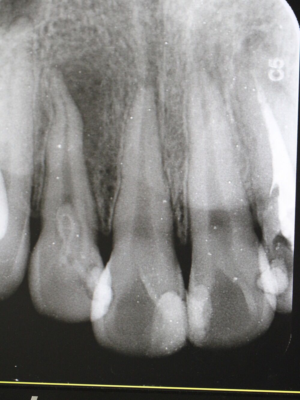 诊断:12牙牙髓坏死? 治疗方案: 1、12牙根管治疗+充填治疗+冠修复 2、12牙择期治疗 3、12牙显微根尖外科手术 4、12牙拔除 5、12牙观察 治疗计划:与患者交流沟通并详细介绍每种治疗方案、费用、时间、预后等,由于患牙根尖病变范围较大,预后欠佳。患者知情、同意并选择方案2,签署知情同意书。 12牙涡轮机开髓,探查根管口,10#,15#K锉疏通根管,根长测量仪测量根管长度,12牙22.5mm,髓腔和根管内放置根管润滑剂,S3扩锉至2506,拍片试尖,X线片示主尖合适。次氯酸啊冲洗根管,P5荡洗,纸尖干燥根管,置氢氧化钙,Caviton暂封。