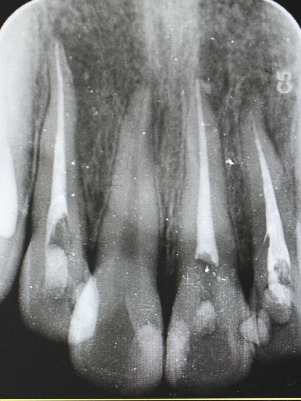 检查:12牙未见明显龋坏,探(-),冷(-),叩(++),无明显松动,牙髓电活力测试无反应,唇侧牙槽粘膜处未见窦道。 X线片:12牙根尖周暗影?