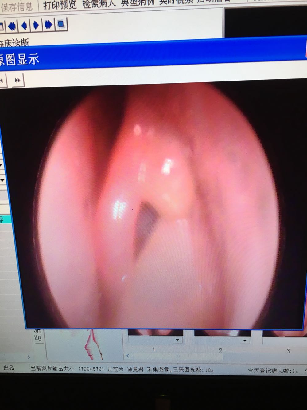 鼻镜检查可见,双侧下鼻甲,苍白水肿,中鼻道处透明荔枝肉 样 物填充。