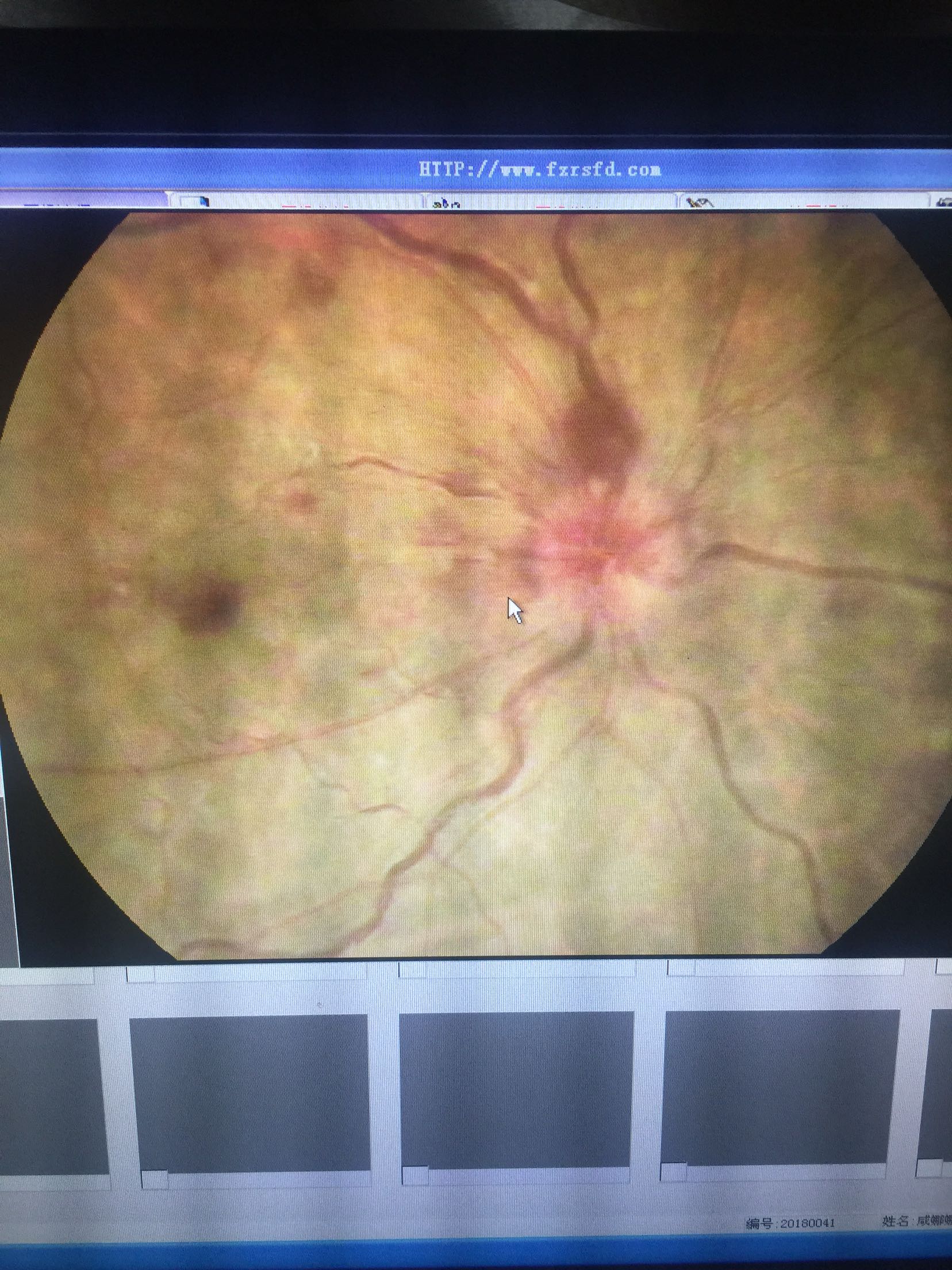 右眼:指数,左眼:0.15 双眼眼睑肤色正常,无红肿,结膜无充血,角膜透明,前房中深,瞳孔正大等圆,虹膜纹理清,晶体无浑浊,右眼眼底可见视盘出血水肿,边界不清,静脉迂曲扩张,黄斑区水肿出血,网膜散在片状出血,