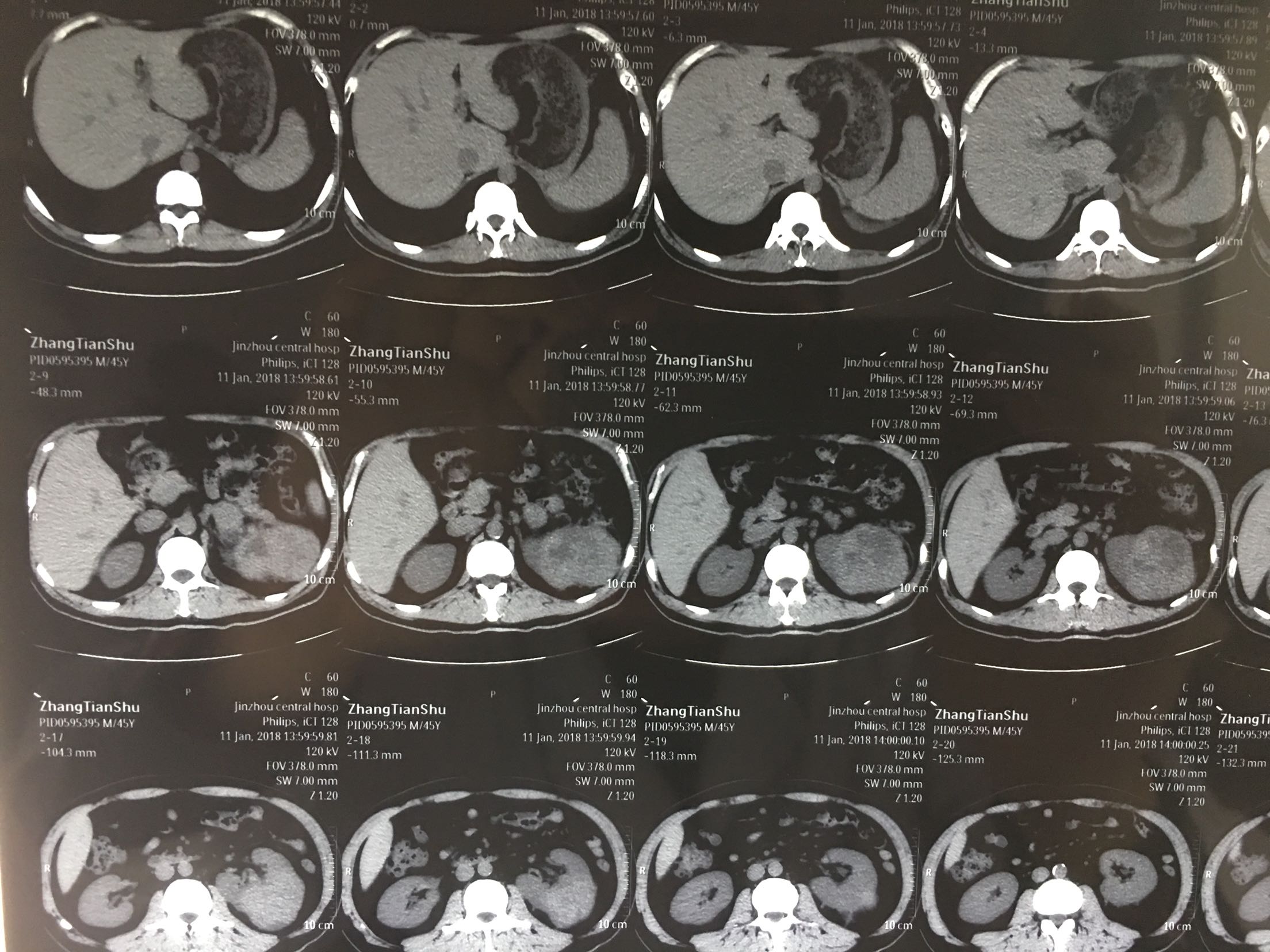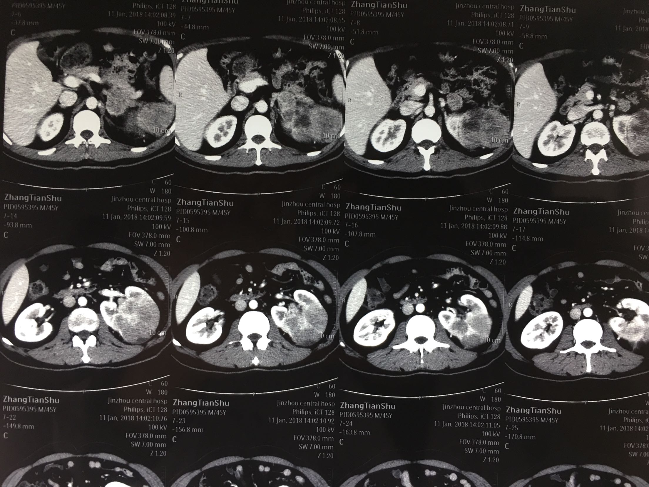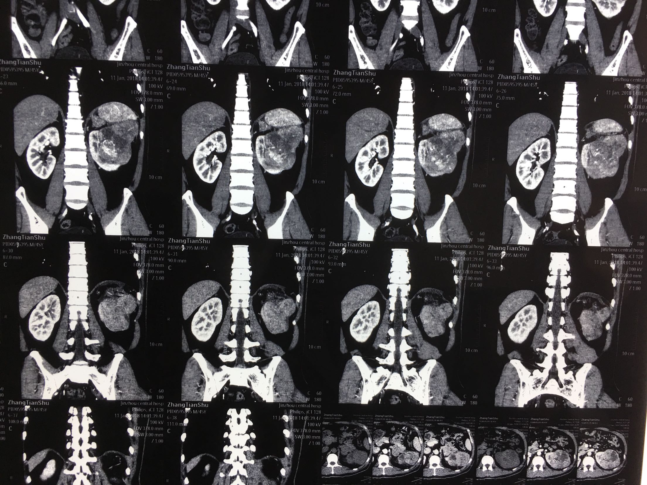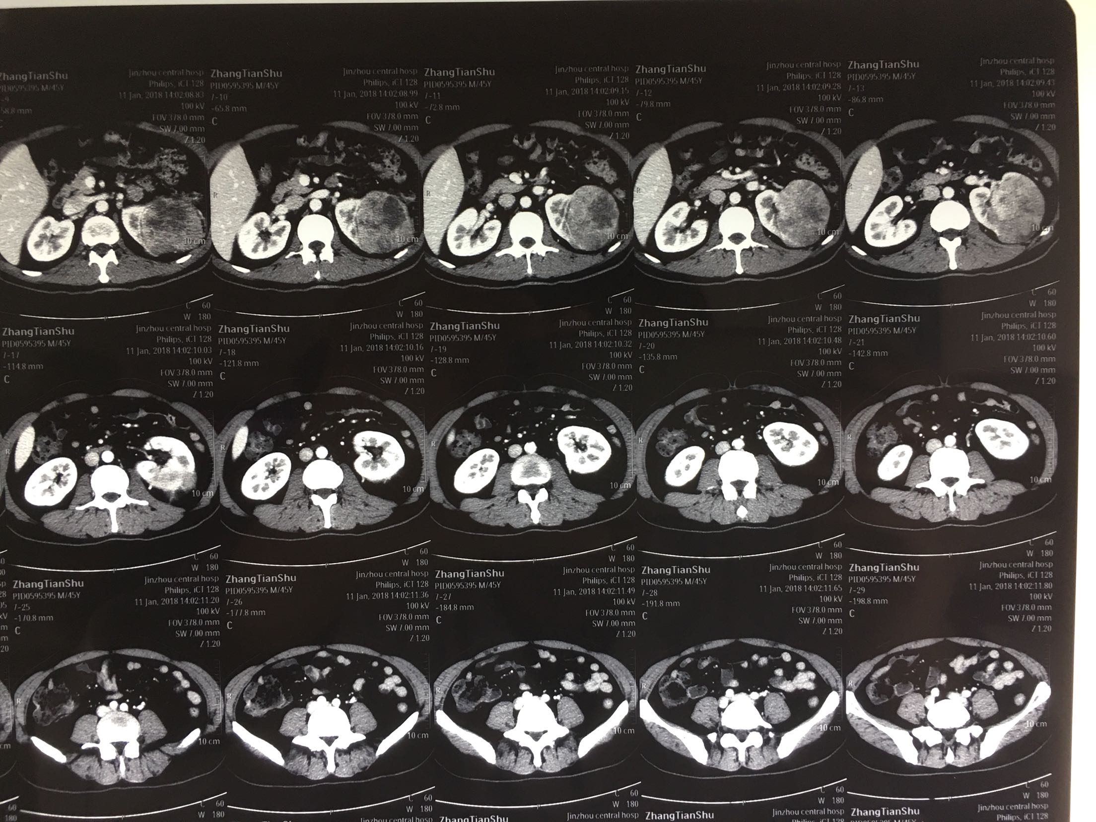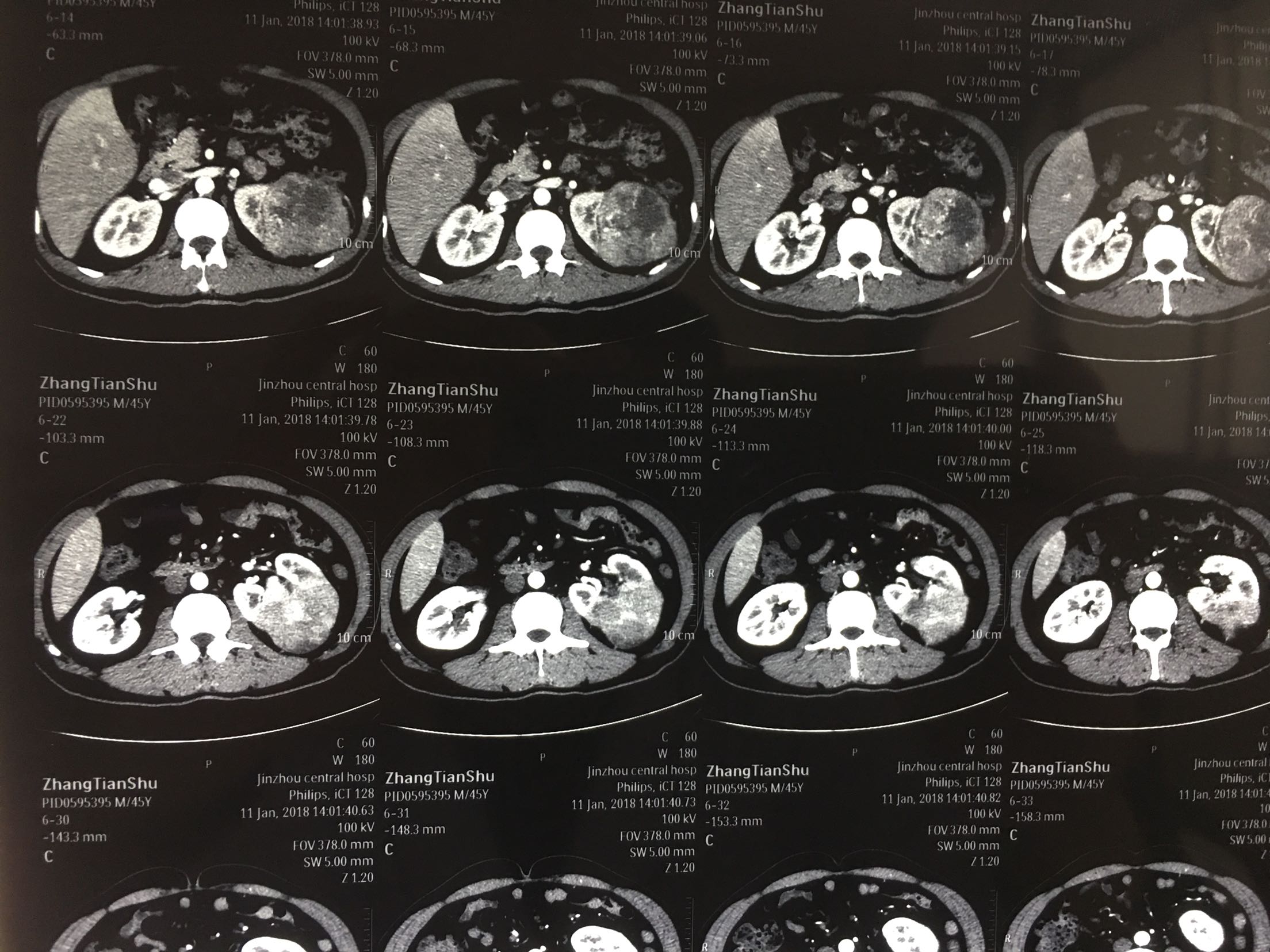 查体:左肾区轻叩击痛,双输尿管走形区无压痛,耻骨上区无隆起及压痛, 辅助检查:泌尿系彩超:左肾肿瘤。 ctu:左肾癌伴同侧肾上腺侵犯。