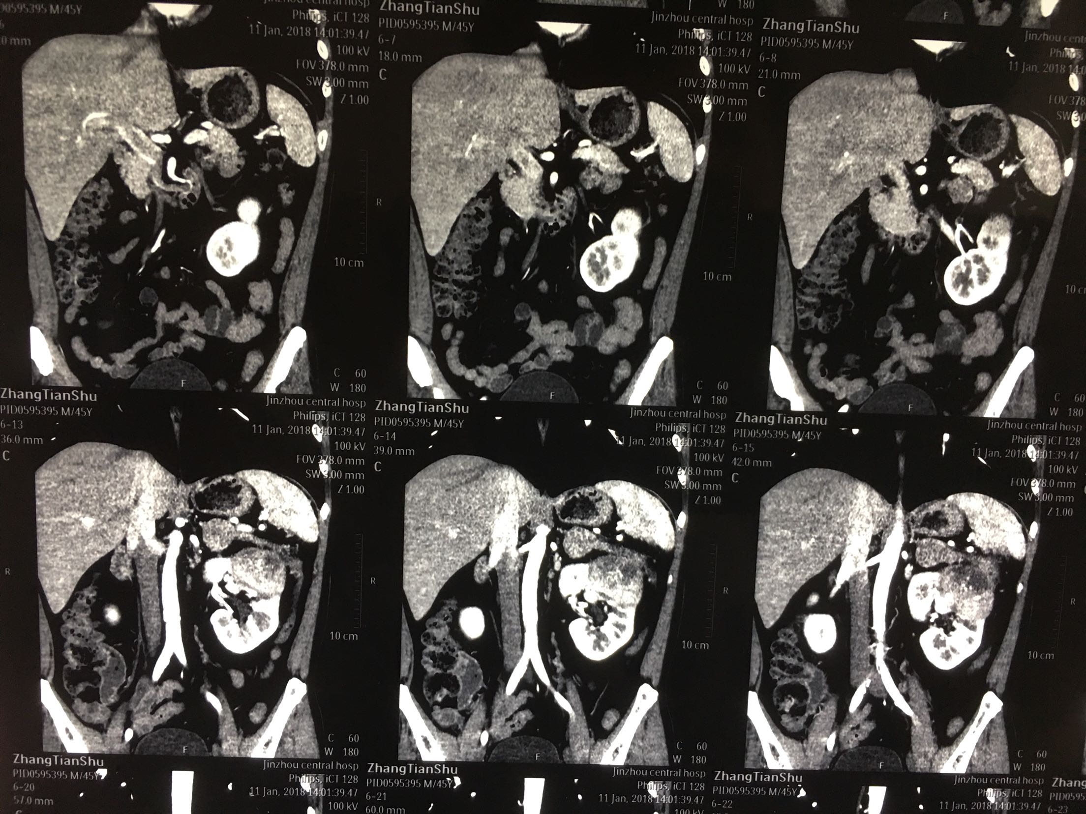 56岁男患 左腰部不适20天为主诉入院,无发热,无恶习及呕吐,无心前区不适,无尿频,无尿急,无尿痛症状。无肉眼血尿。