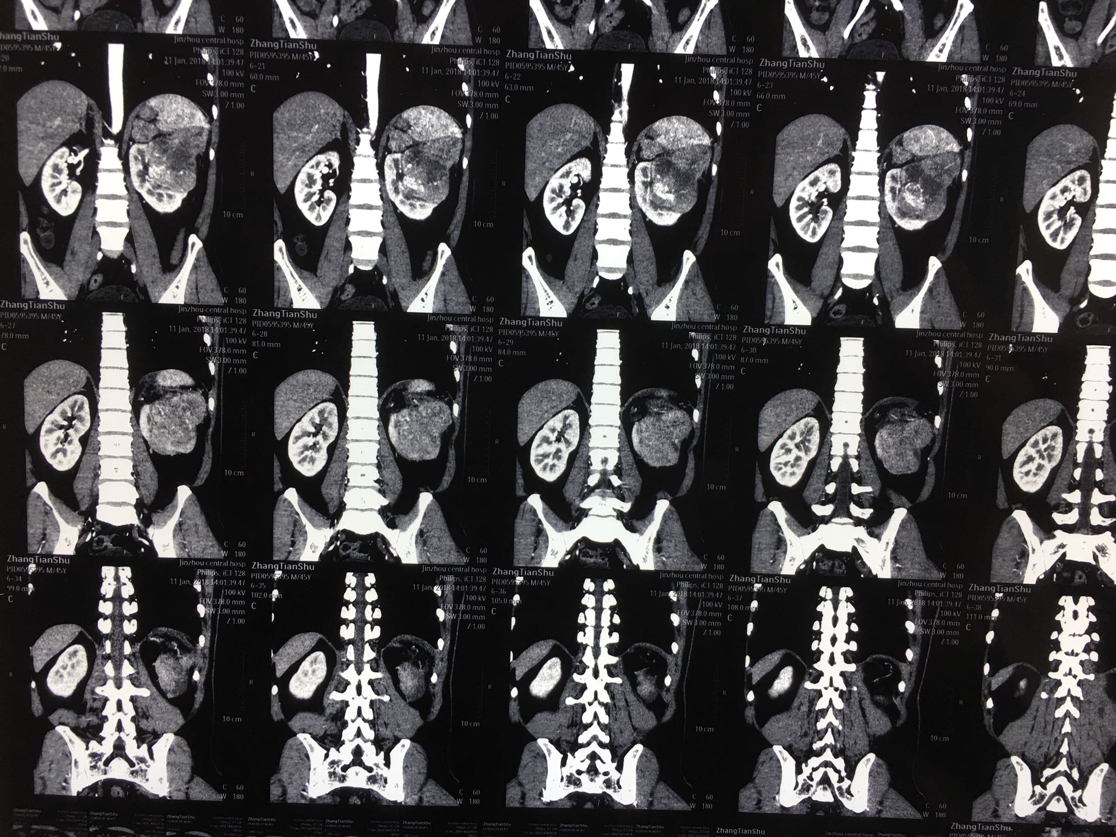 术后病理:左肾透明细胞癌局部肉瘤样变,肾上腺及腹膜累及。 讨论:肾脏肿瘤肉眼血尿,腰疼,腹部包块为晚期肿瘤症状,预后不良。