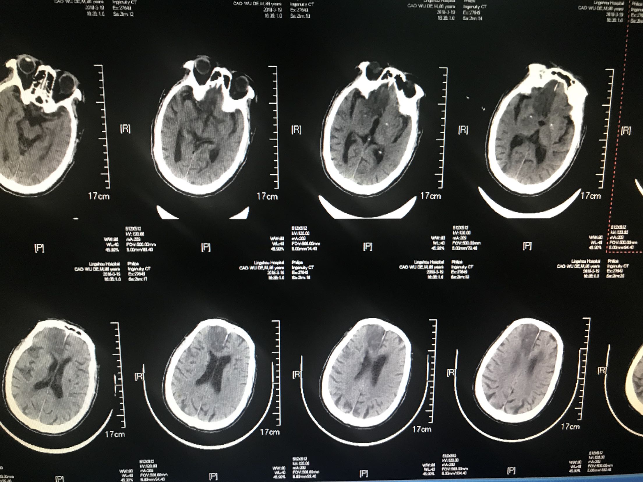 患者88岁不能行走1小时入院,房颤心衰起搏器安装痴呆病史,患者1小时前被家人发现倒在地上,不能言语,不能行走,急诊查血压210/120mmhg,查透头颅Ct够收住院
