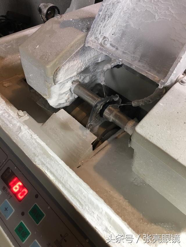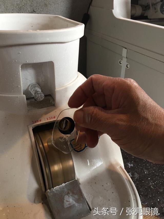 5.将先前做好的模板嵌入模板卡位,镜片置入镜片卡位,磨片。注意左右眼别区分。