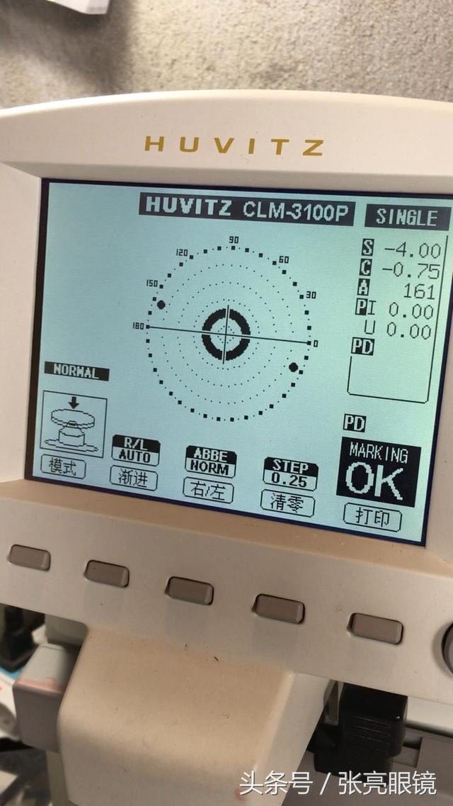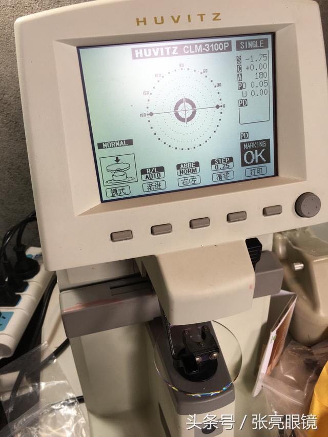 3.依据验光单取出相应度数镜片,焦度计检测出镜片光心,打点,如果带散光镜片,同时标示出准确轴位并打点