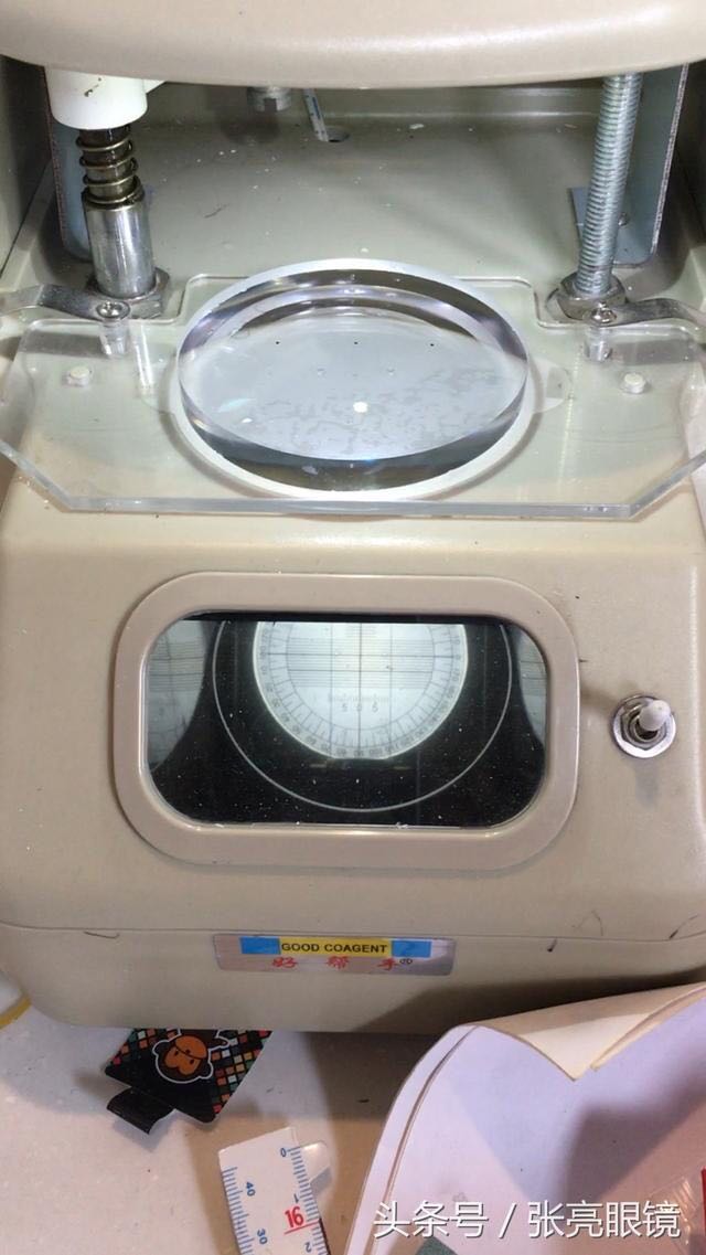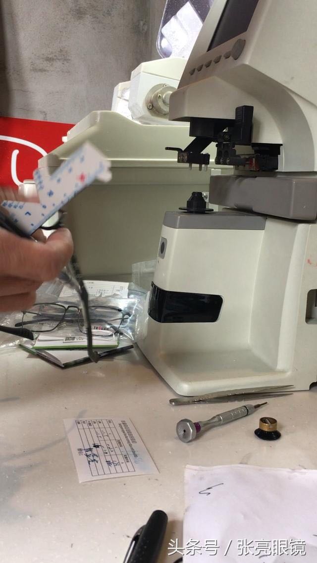8.校正镜框,再放入焦度计测出加工完成的眼镜,度数与原验光单据的度数误差在工艺许可范围内属合格。超出误差准许范围属不合格产品。查明原因,修正不了的,重新磨片,前面镜片作废。