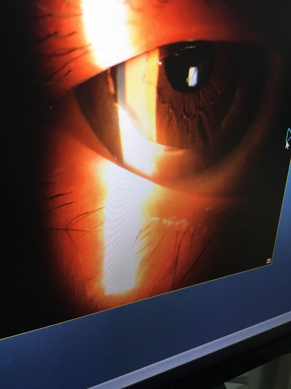 眼科检查:双眼结膜无充血,角膜边缘可见环形白色变性区,周围有新生血管长入。角膜中央透明,前房适中,房水清,瞳孔圆,晶体轻混,余未见明显异常。