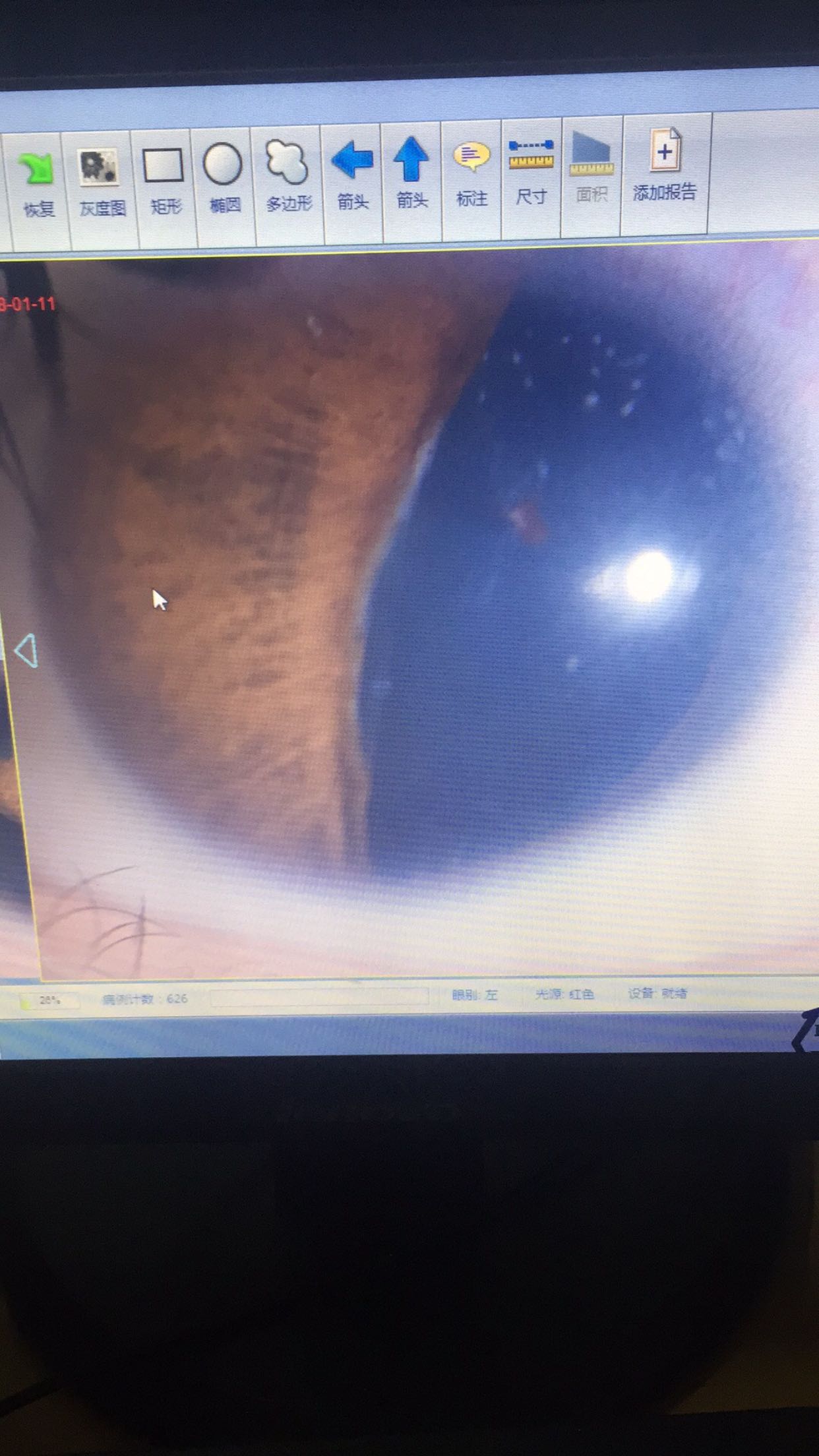 右眼:0.1 左眼:0.1 双眼睑肤色正常,结膜无充血,双眼角膜小于10mm,角膜尚透明,前房略浅,右眼虹膜见3处不规则缺损,瞳孔呈多瞳状,瞳孔中央虹膜遮挡,左眼颞侧虹膜缺损,晶体皮质密度高,眼底视盘苍白,盘周脉络膜缺损,累及黄斑区