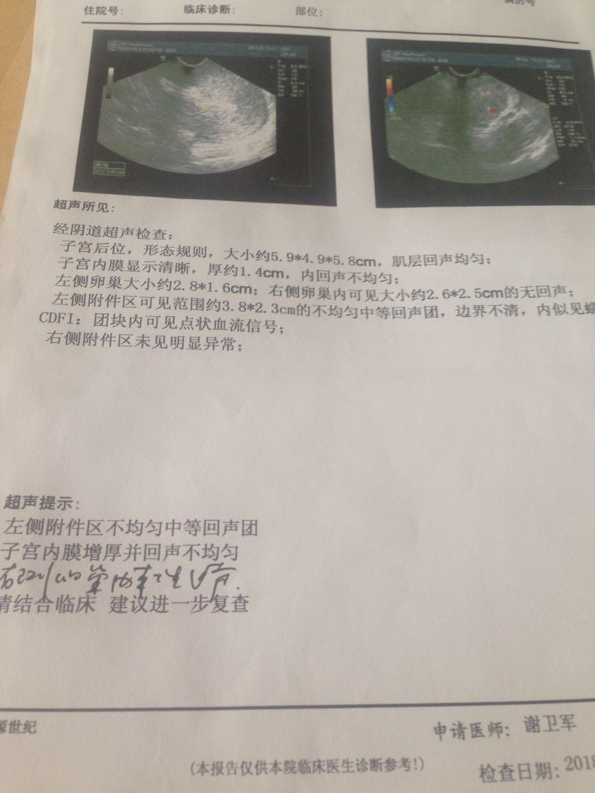体 温38 度,脉搏106次/分,血压110/70mmHg,心肺未闻及异常,腹软,压痛阳性,反跳痛阳性,无肌紧张。妇科检查:阴道可见少量血性分泌物,宫颈光滑,有举痛,子宫:约孕40天大小,质软,活动欠佳。左附件区增厚,明显压痛,右附件区轻压痛。