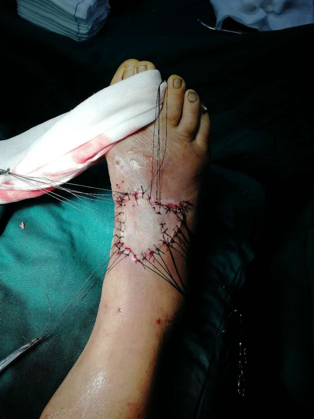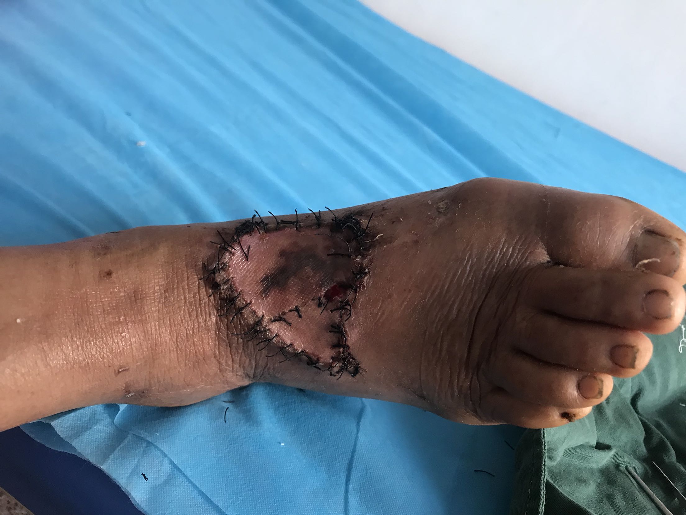 右足背皮肤软组织毁损伤。清创,缝合,vsd负压吸引术。