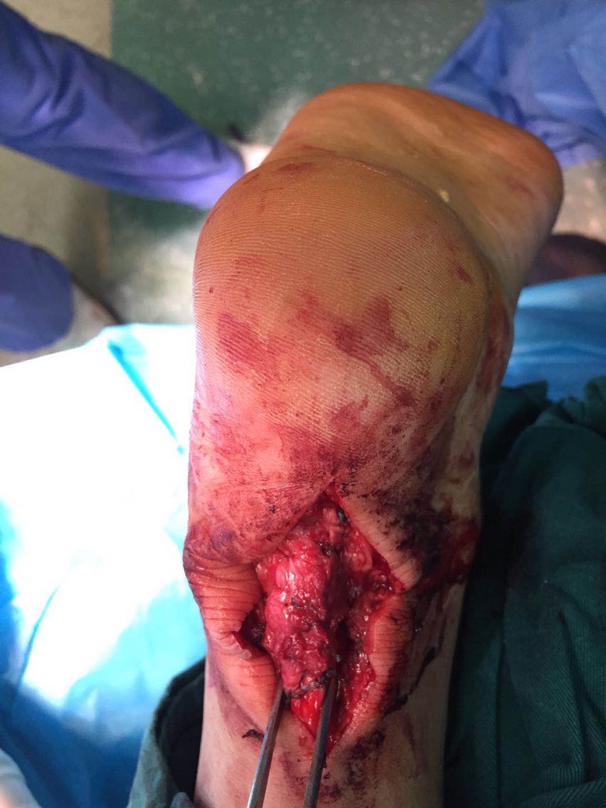 诊断:右足跟腱开放性完全断裂。 治疗:急诊行清创+右足跟腱缝合修复+石膏外固定术。