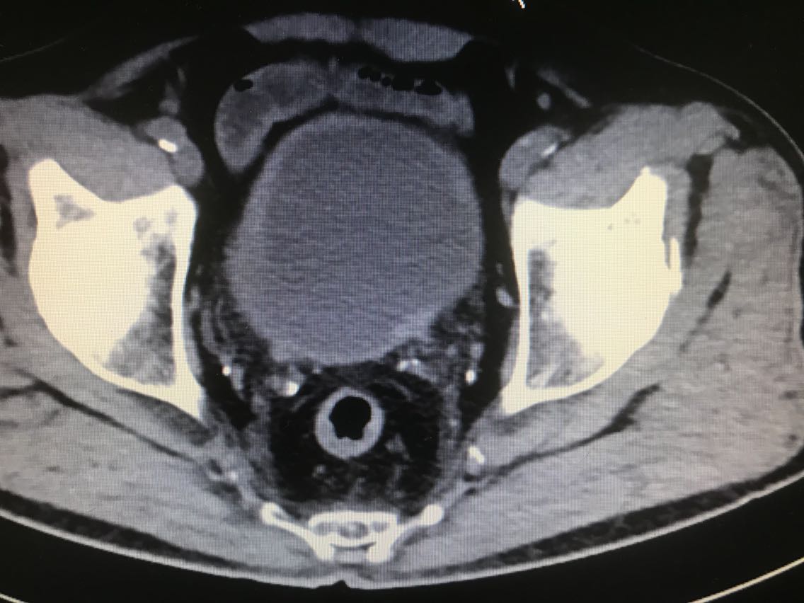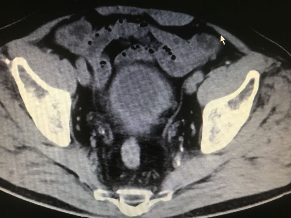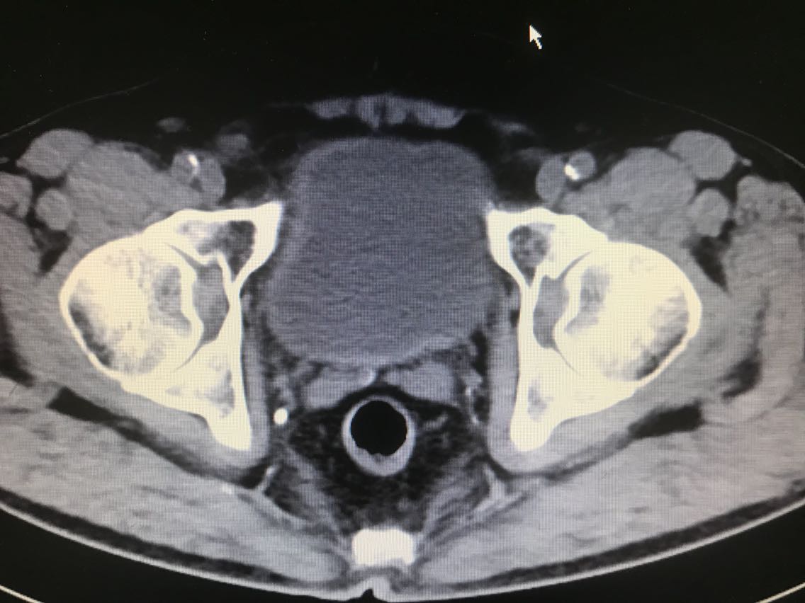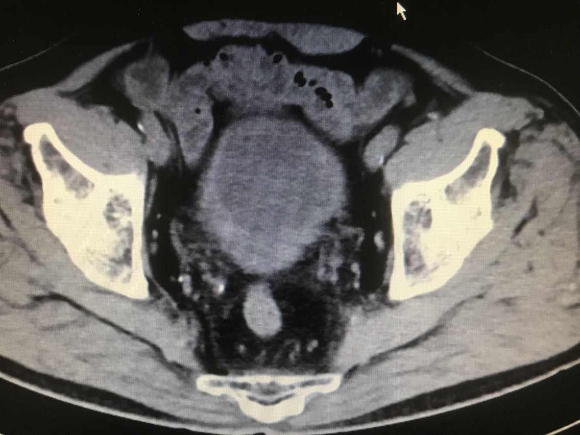 查体:无特殊。 辅助检查: 全腹增强CT示:膀胱做后壁结节影,多系占位;直肠下段管壁肿胀;腹股沟区域可见淋巴结显示; 膀胱占位病检示:乳头状尿路上皮癌(WHO高级别),局灶浸润性尿路上皮癌形成,癌浸润固有层,固有肌层未见癌浸润。“基底”:电切标本,送检纤维结缔组织及固有几层均未见癌浸润。