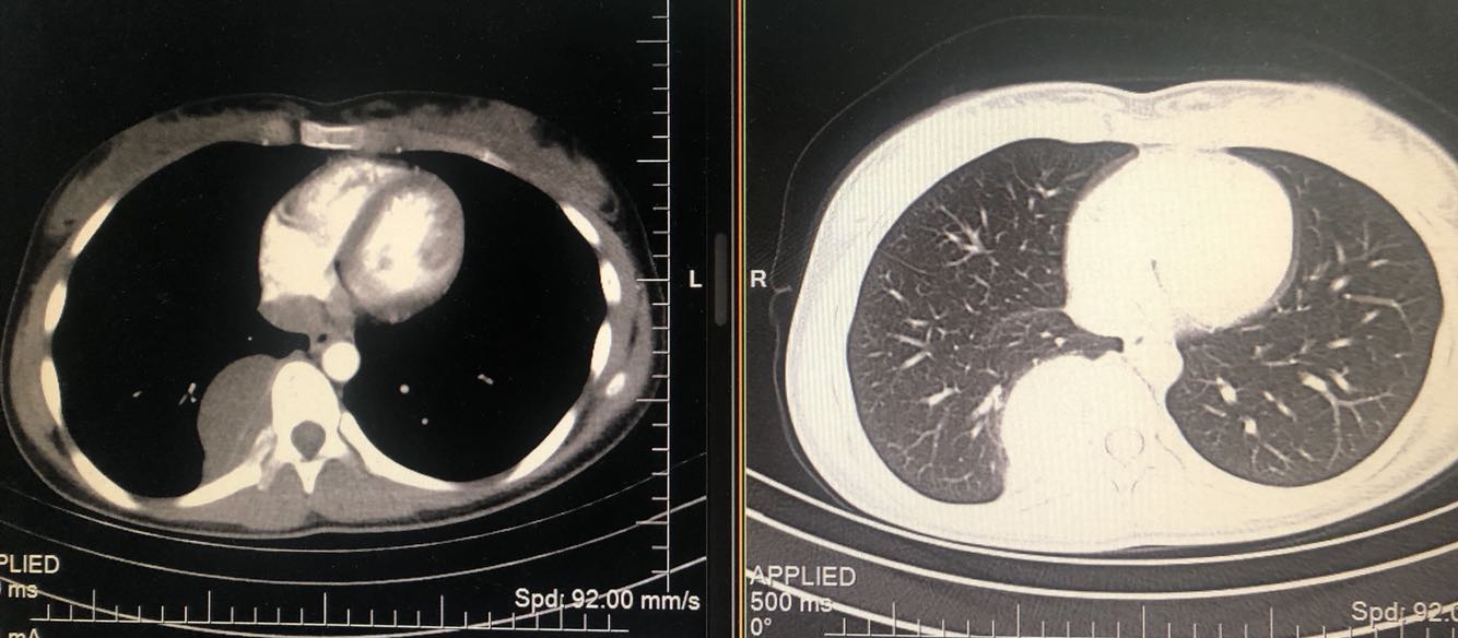 查体:浅表淋巴结不大,双肺叩清音,双肺呼吸音清,未闻及干湿性啰音。心腹查体未见异常。 既往史:体健,否认药物过敏史。 辅助检查:肺CT示后下纵膈脊柱旁软组织密度影,边界清楚。
