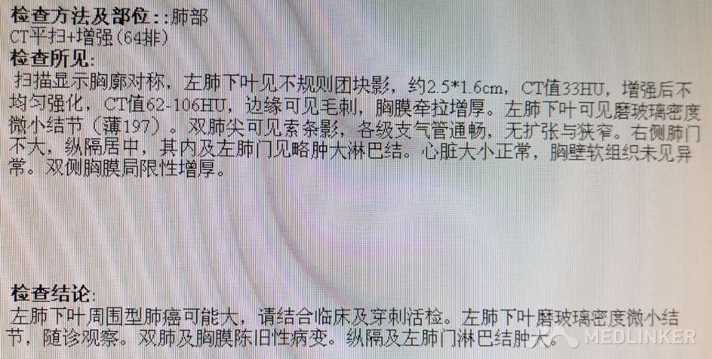 患者,男,45岁 主诉:体检发现左肺下叶占位10天 现病史:患者于2周前体检行CT检查发现左肺下叶占位,于我院行PETCT检查,结果待回报,现为求进一步诊治来我科,病来饮食睡眠可,二便如常,体重近期无明显变化 既往史:一般健康状况:良好 药物过敏史否认 传染病史:否认肝炎结核病病史 预防接种史:按计划 手术外伤史:无, 输血史:否认 疾病史:否认 个人史:出生地— 迁徙史:无 冶游史:无 嗜烟嗜酒:无 职业及工作环境:无烟尘、无毒物及放射性物质接触史 婚姻史:结婚年龄:适龄岁 配偶健康状况:良好 其他:无 家族史:父亲:健康 母亲:健康 子女:健康 兄弟姐妹:健康 家族遗传病史:否认 家族中传染病史:无