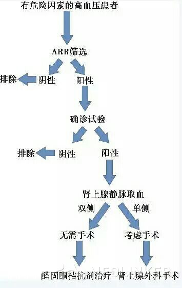 续表 根据上述结果,患者盐水负荷试验阳性,因此诊断考虑原发性醛固酮增多症诊断成立。分侧肾上腺静脉取血提示,左侧肾上腺分泌醛固酮增多,但与对侧比较无明显分泌优势,考虑到患者本身存在左侧肾上腺饱满而无皮质醇增多,并且ALD、PRA测定方法学上容易变化的特点,判断左侧肾上腺为优势分泌。同时患者立位的PR.1.09ng/(ml·h),肾上腺CTA仅见左侧肾上腺饱满,因此判断左侧肾上腺增生可能大。患者年轻、靶器官损伤重、药物抵抗,因此给予了左侧肾上腺经皮经导管超选择性化学消融治疗(SAAE),介入治疗后顺利出院。 术后随访,患者血压控制不好,继续服用包括螺内酯20m.tid在内的足量四种降压药物仍不达标,在家自测基本在160/100mmHg以上,1个月后诊室血压仍达190/120mmHg,复测血钾仍低于3.5mmol/L。第二次收入院进行治疗。 2.科室疑难病例讨论 本例特点,存在问题,分析既往及病史资料,提出疑问,进一步检查(鉴别诊断)。 第二次收入院后,从图32-2所示诊断流程看符合原发性醛固酮增多症的诊断。 原醛重点筛查的对象: 难治性高血压或高血压二级(JN.7)(>160~179/100~109mmHg),3级(血压>180/110mmHg); 药物抵抗性高血压,常规药物控制效果不佳; 高血压伴有持续性或利尿剂引起的低钾血症; 高血压伴有肾上腺意外瘤;有早发高血压病史;40岁以前发生脑血管意外家族史的高血压患者; 同时也推荐在原醛症患者一级亲属的所有高血压患者。 考虑继发性高血压的原因为原发性醛固酮增多症的可能性最大,但是存在一系列的问题: (1)患者ALD绝对值升高不明显,一般情况下ALD升高超过15ng/dl,而该患者有低于15ng/dl的时候,需要警惕假性醛固酮增多症。