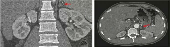 图32-1肾上腺CT提示左侧肾上腺饱满(箭头所示)