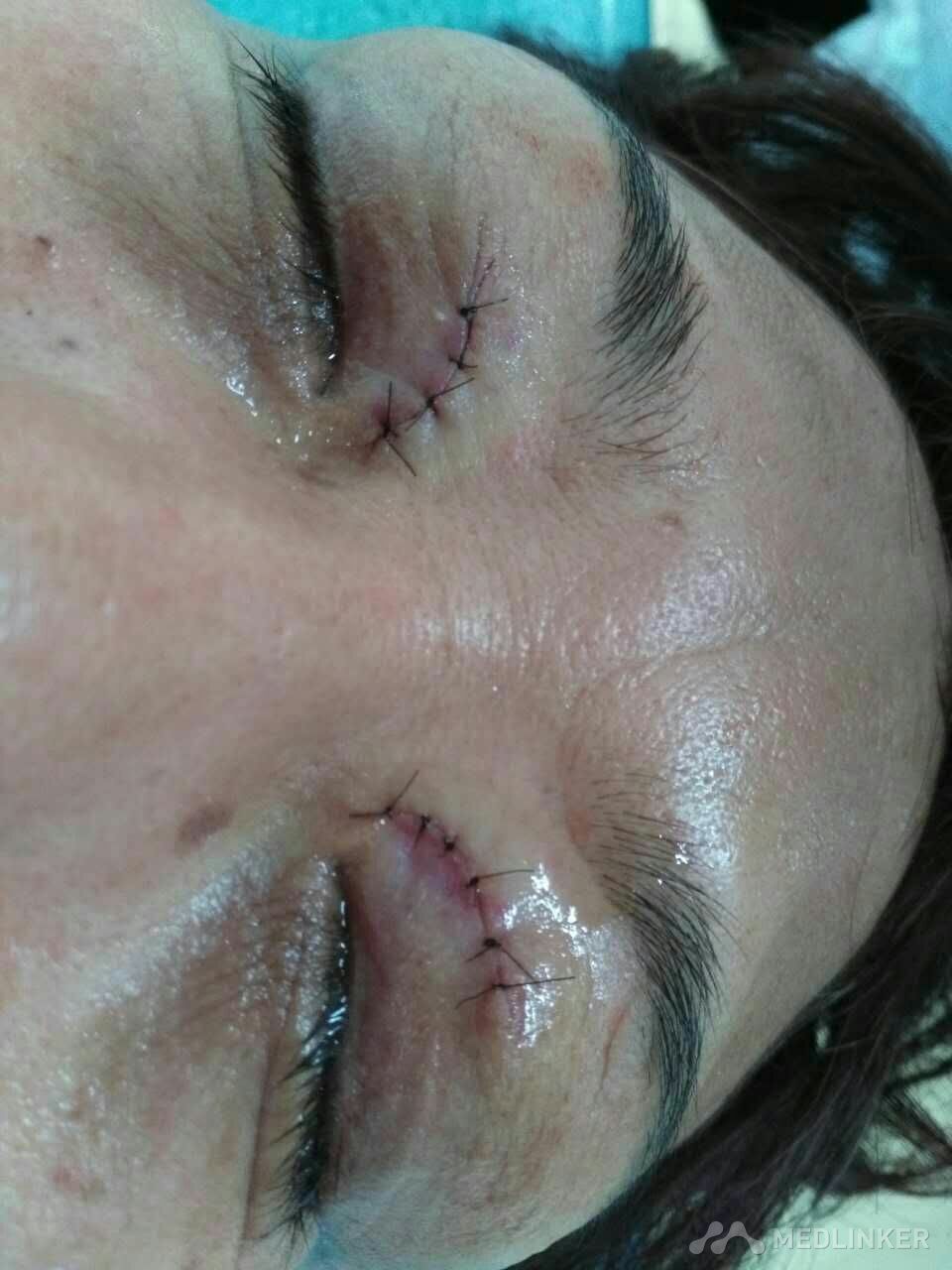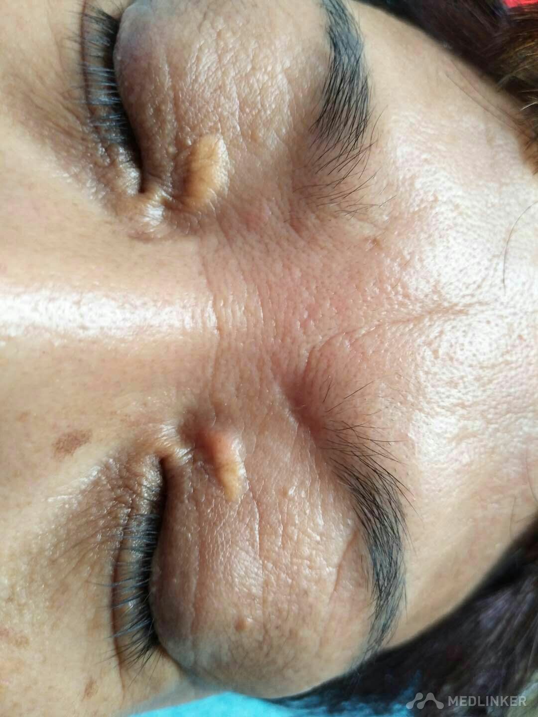 双眼上睑黄色素瘤 治疗,以手术治疗为主,设计皮肤条索状切口,切除黄色素瘤,皮肤对合缝合加压包扎!