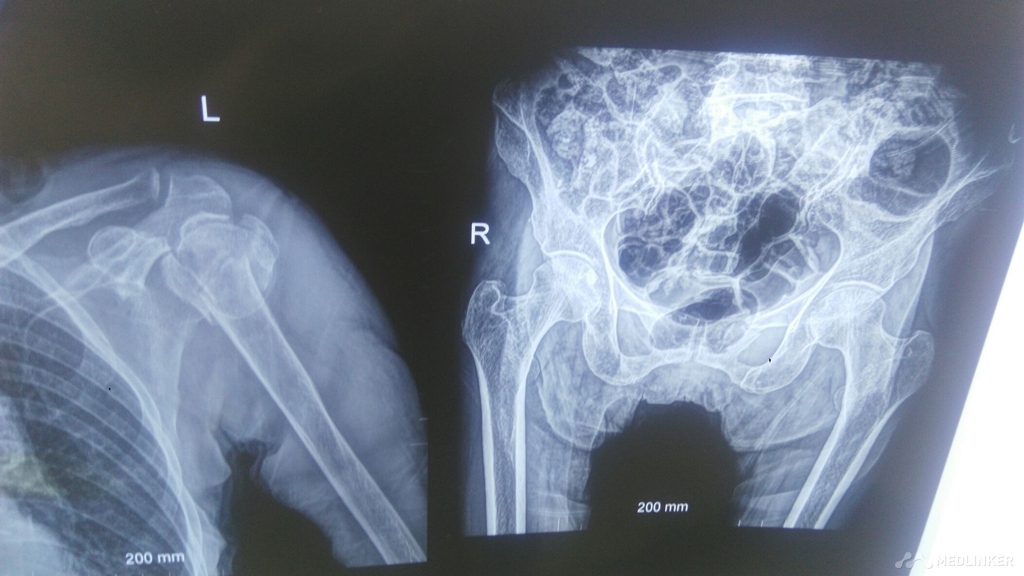 左肩部,左髋部肿痛。有高血压,冠心病。左肩部以外科颈处压痛,叩痛阳性。