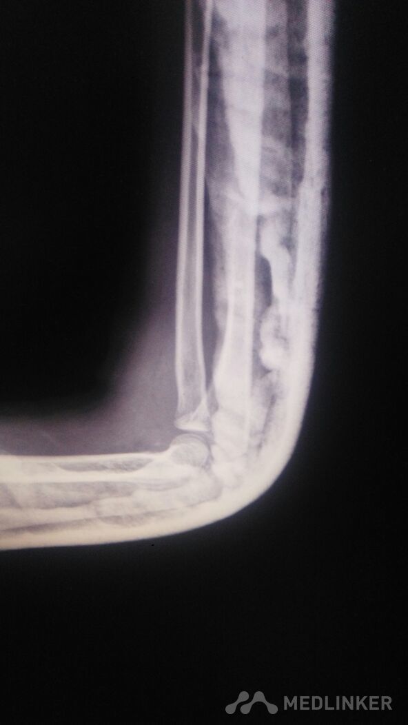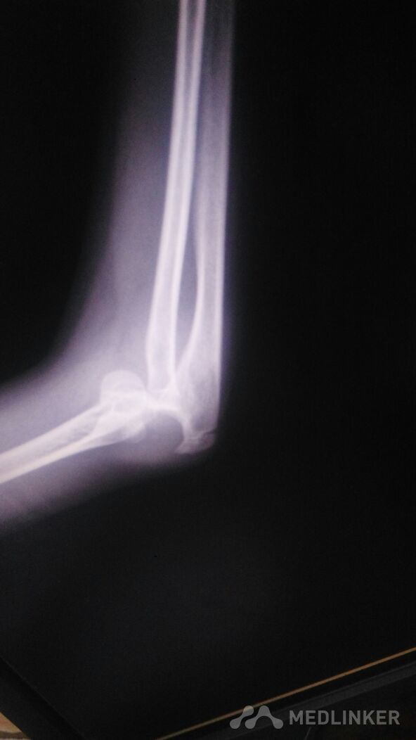 左肘部肿痛畸形。以尺骨鹰嘴处为著,压痛阳性,叩痛阳性。左肘部活动受限。
