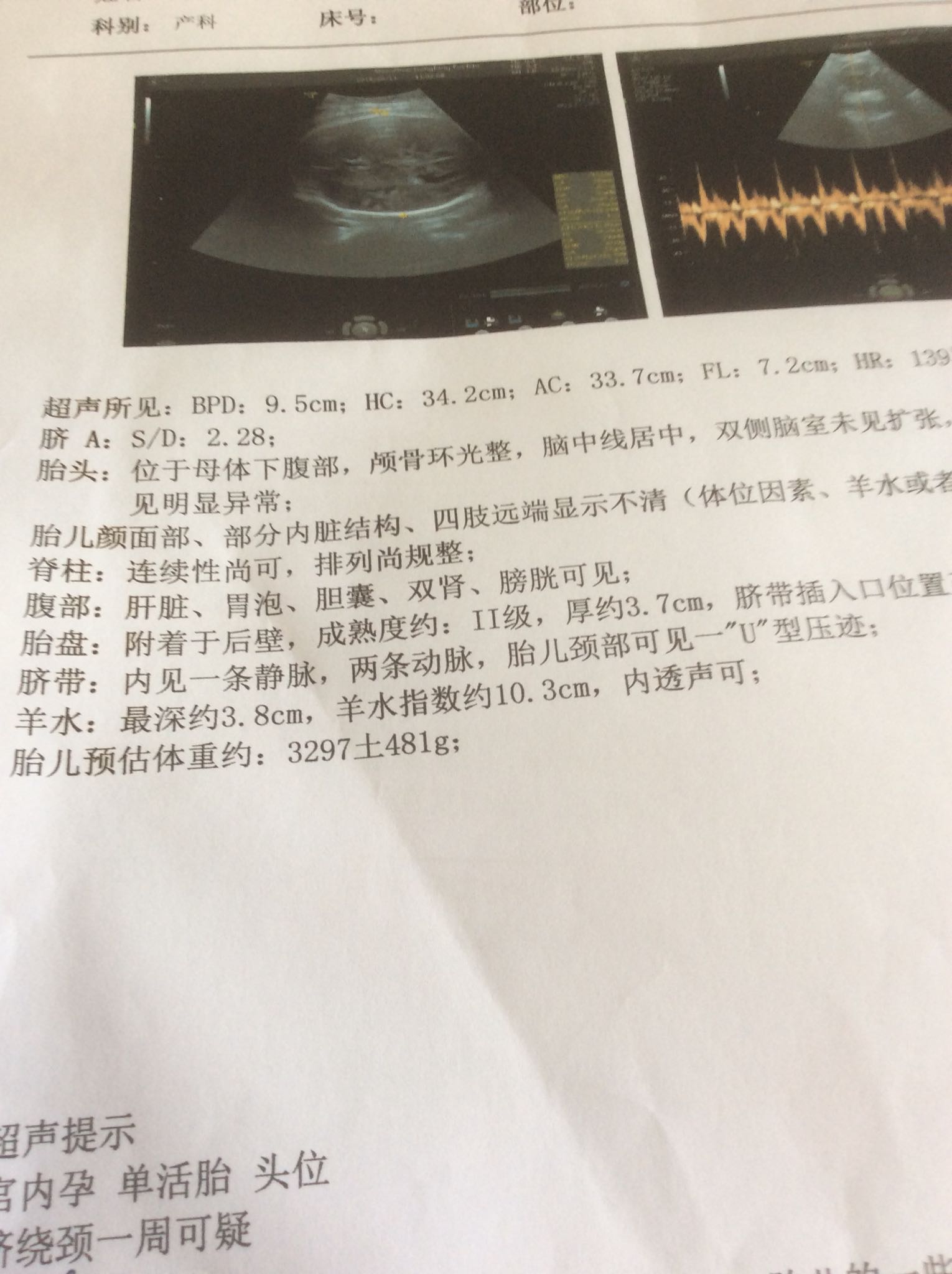 体格检查:生命体征正常,心肺未闻及异常,腹部膨隆。产科检查:宫高35厘米,腹围100厘米,胎头浅定,胎心148次/分,骨盆测量未见异常,无宫缩。阴道检查:宫颈退缩50%,质软,宫口居后,容一指松,胎头棘上3厘米。 辅助检查如图