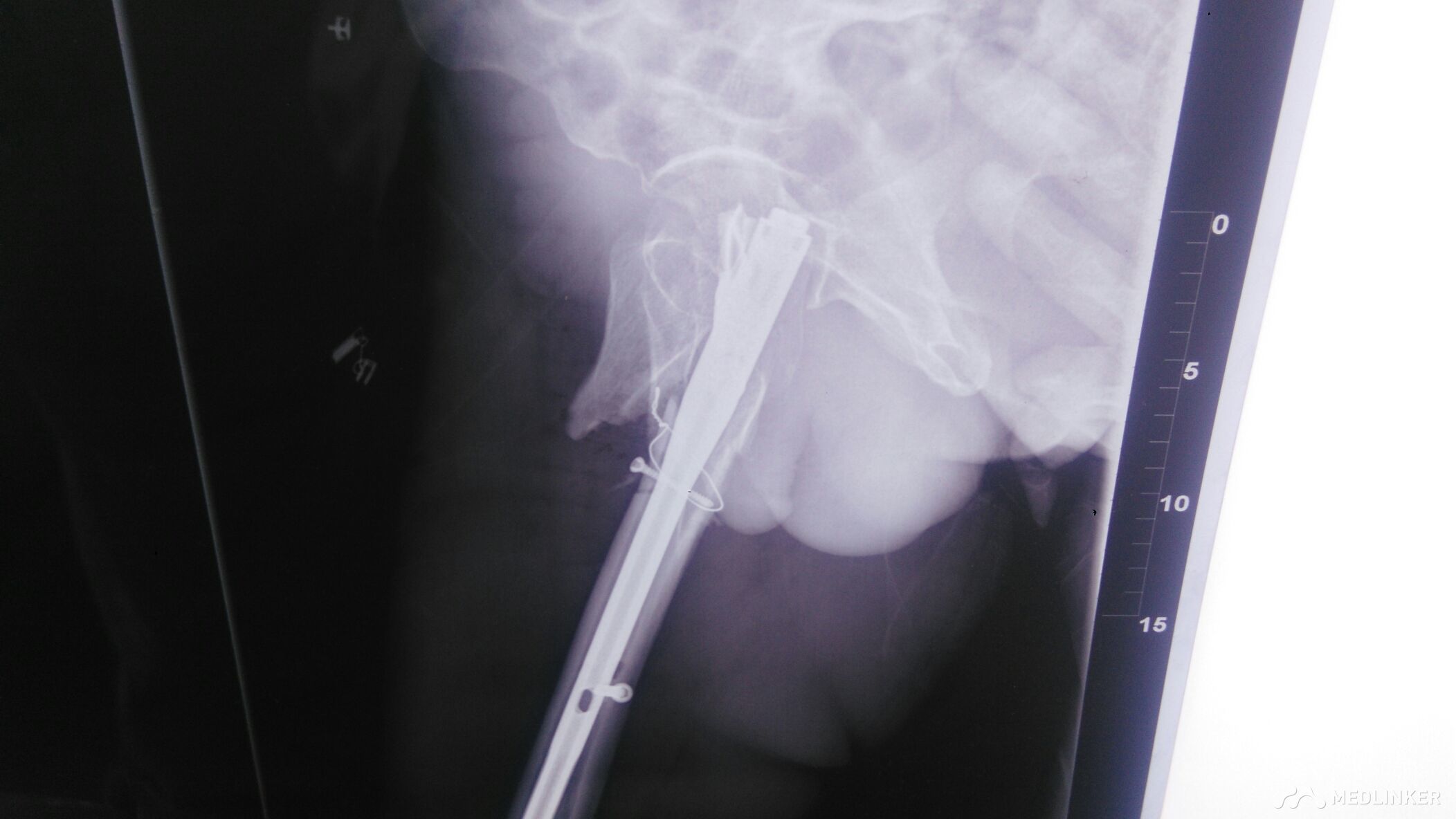髋部手术。髋部畸形明显,肿胀明显。以股骨外侧为著。足部血运正常,感觉正常。