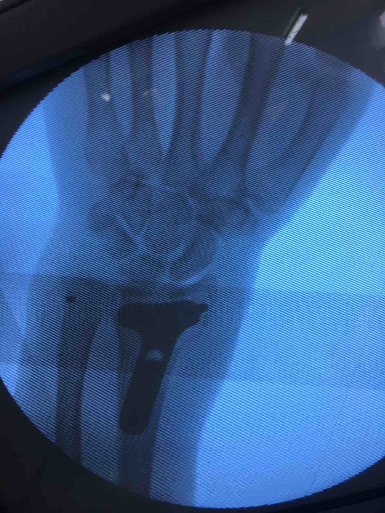 摔伤后腕部肿痛,活动受限4天入院。4天前在外院行手法整复,复查关节面塌陷,尺偏角掌倾角变小,后来我院就诊。
