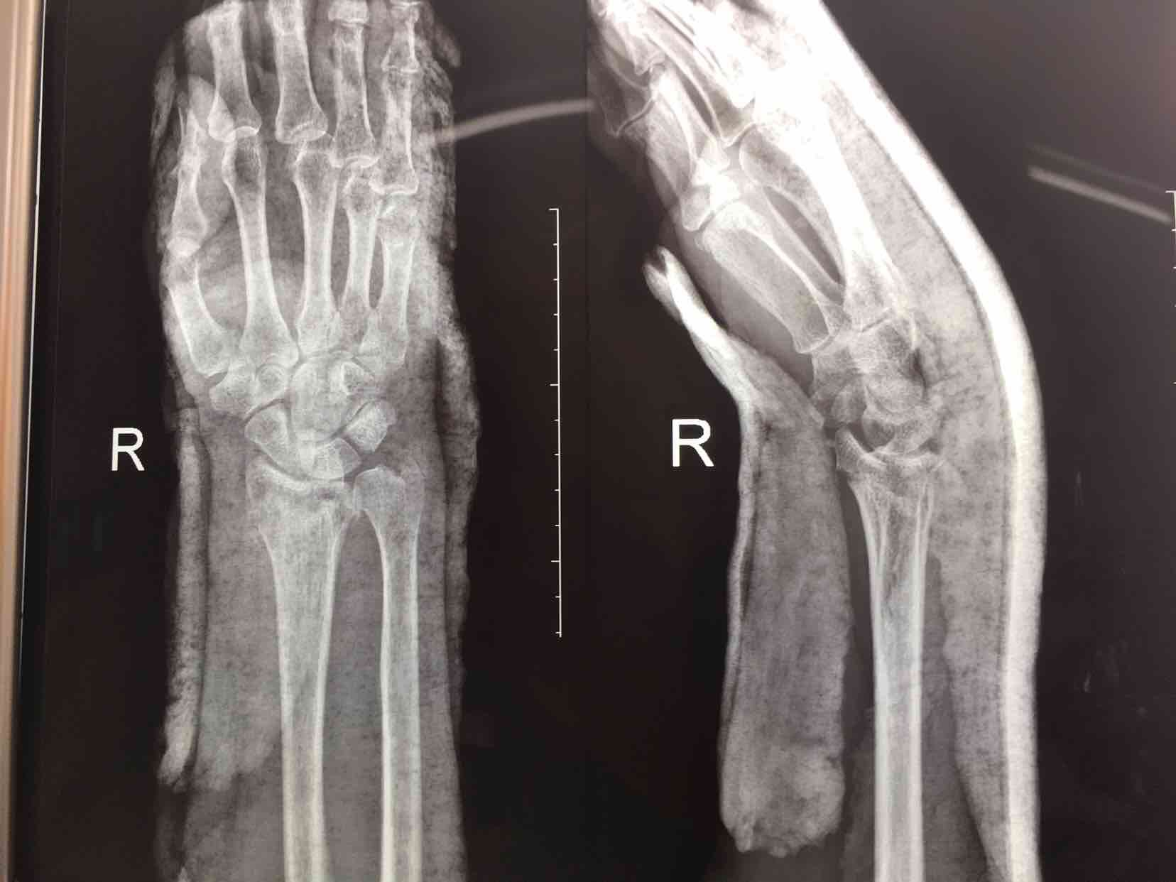 诊断:右侧克雷氏粉碎性骨折完善术前准备,在臂丛麻醉下行切复内固定术,术后抗炎,消肿等对症处理。
