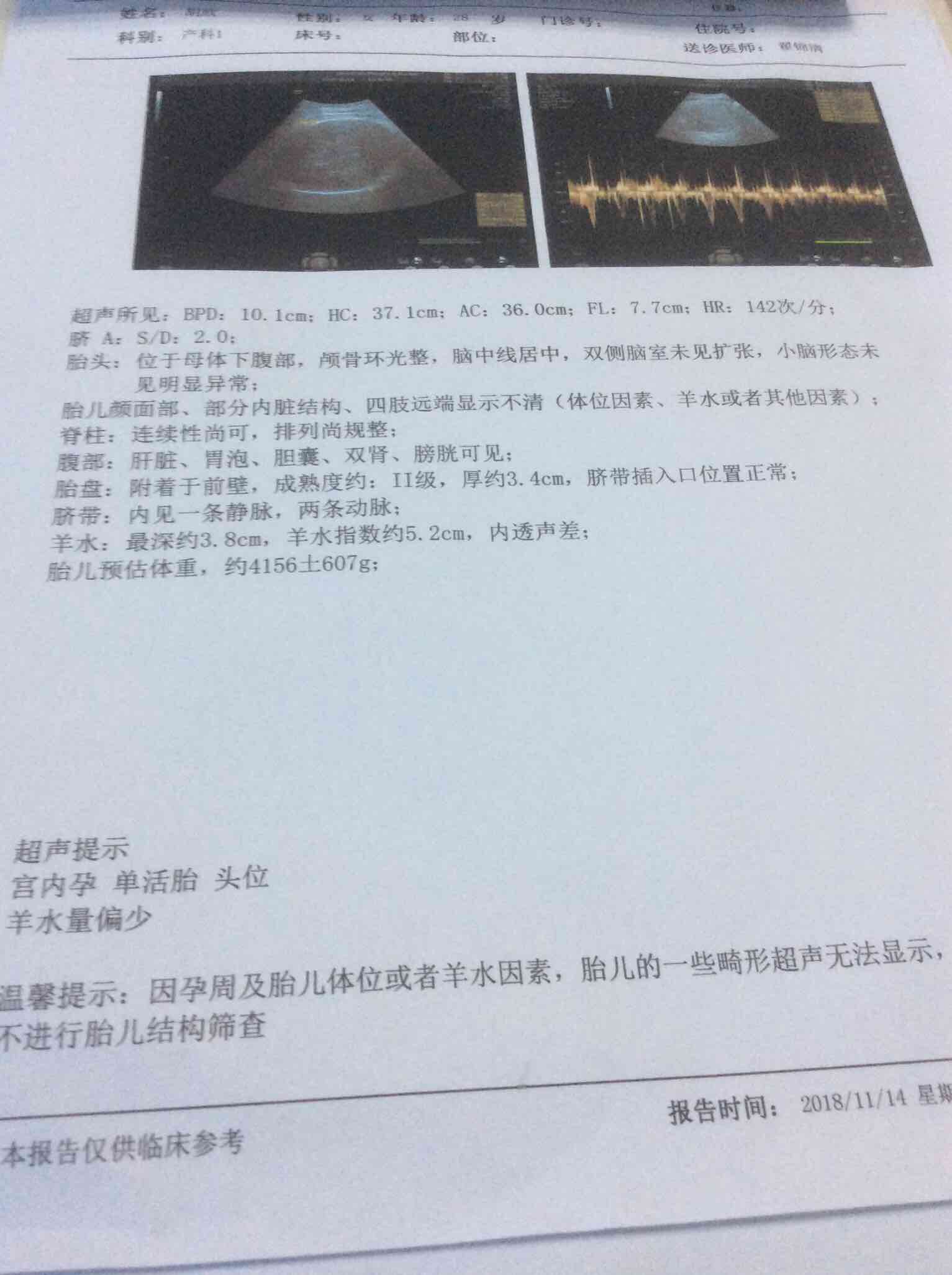 体格检查:生命体征正常,心肺未闻及异常,腹部膨隆。产科检查:宫高37厘米,腹围109厘米,胎先露:头,已衔接。胎心率130次/分,宫缩规律。阴道检查:宫颈管消退80%,质软,宫口居中,容两指松,头先露棘上2厘米。胎膜未破,胎儿估重4000克。辅助检查如图