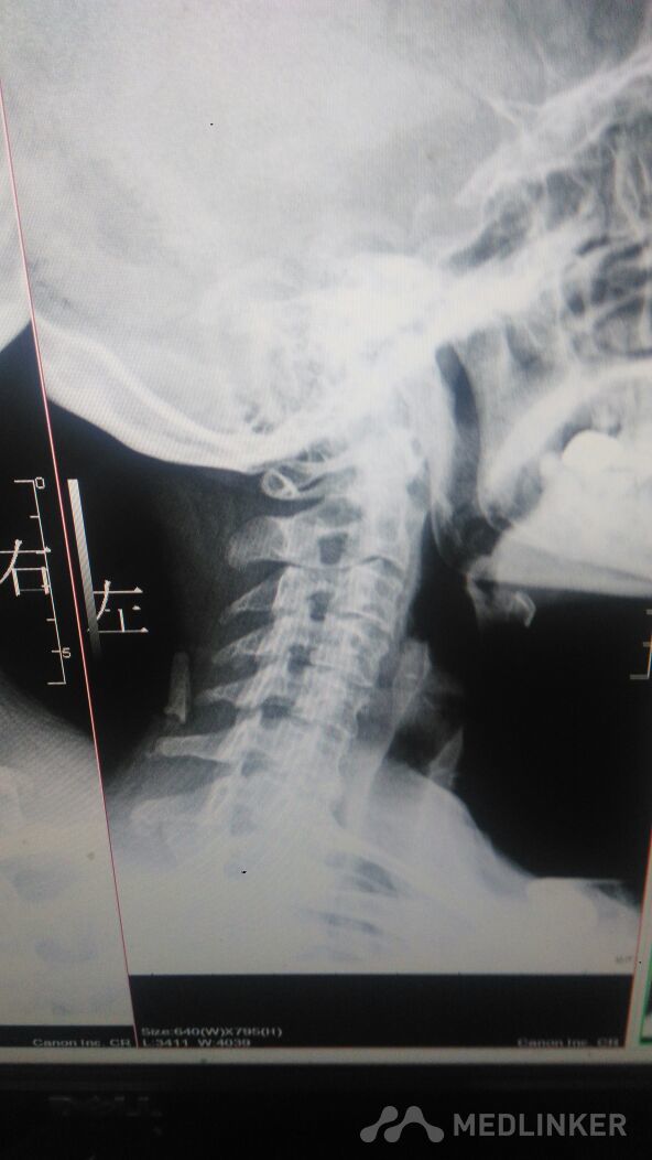 颈部疼痛,有长期看手术史。颈部压痛阳性,叩痛阴性。颈部旋转功能受限。