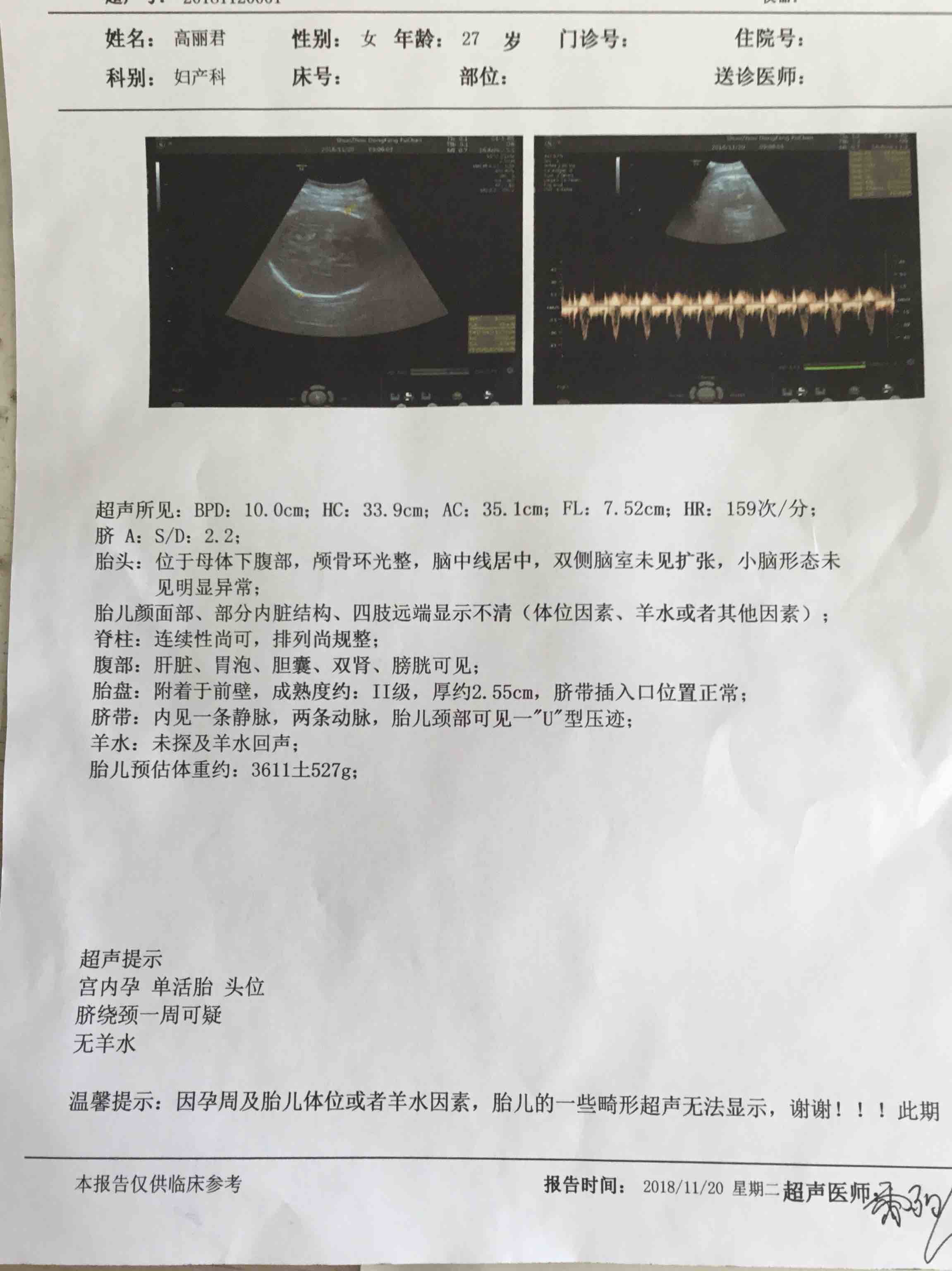 产科检查,宫高30cm,腹围90cm,先露头,固定,规律宫缩30秒/4-5分,胎心130次/分。阴道检查,宫口开大2cm,宫颈管消,先露头,棘平,胎膜未破。骨盆测量正常,胎儿估重3000g。电子胎儿监护,基线正常,变异好,规律宫缩。辅助检查,彩超如图。