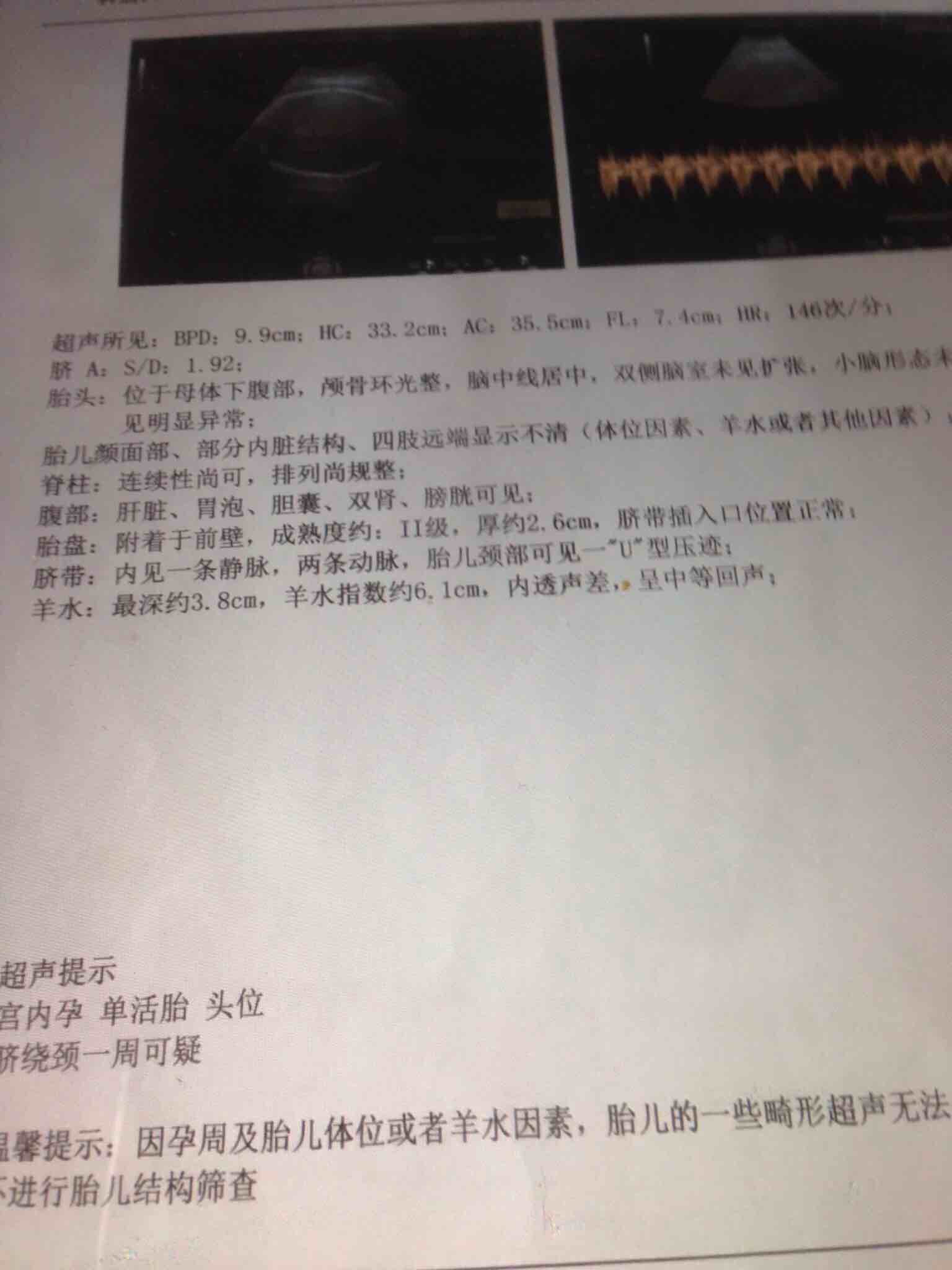 查体:体温36.5摄氏度,脉搏86次/分,呼吸20次/分,血压110/70mmHg。心肺未闻及异常,腹部膨隆。产科检查:宫高38厘米,腹围98厘米,头浮,跨耻征可疑,胎心148次/分,电子胎儿监护:基线正常,变异可。骨盆测量未见异常,无菌下阴道检查:宫口容一指松,质软,宫颈管消退60%,胎膜未破,胎头未入盆,胎儿估重3700克。彩超如图