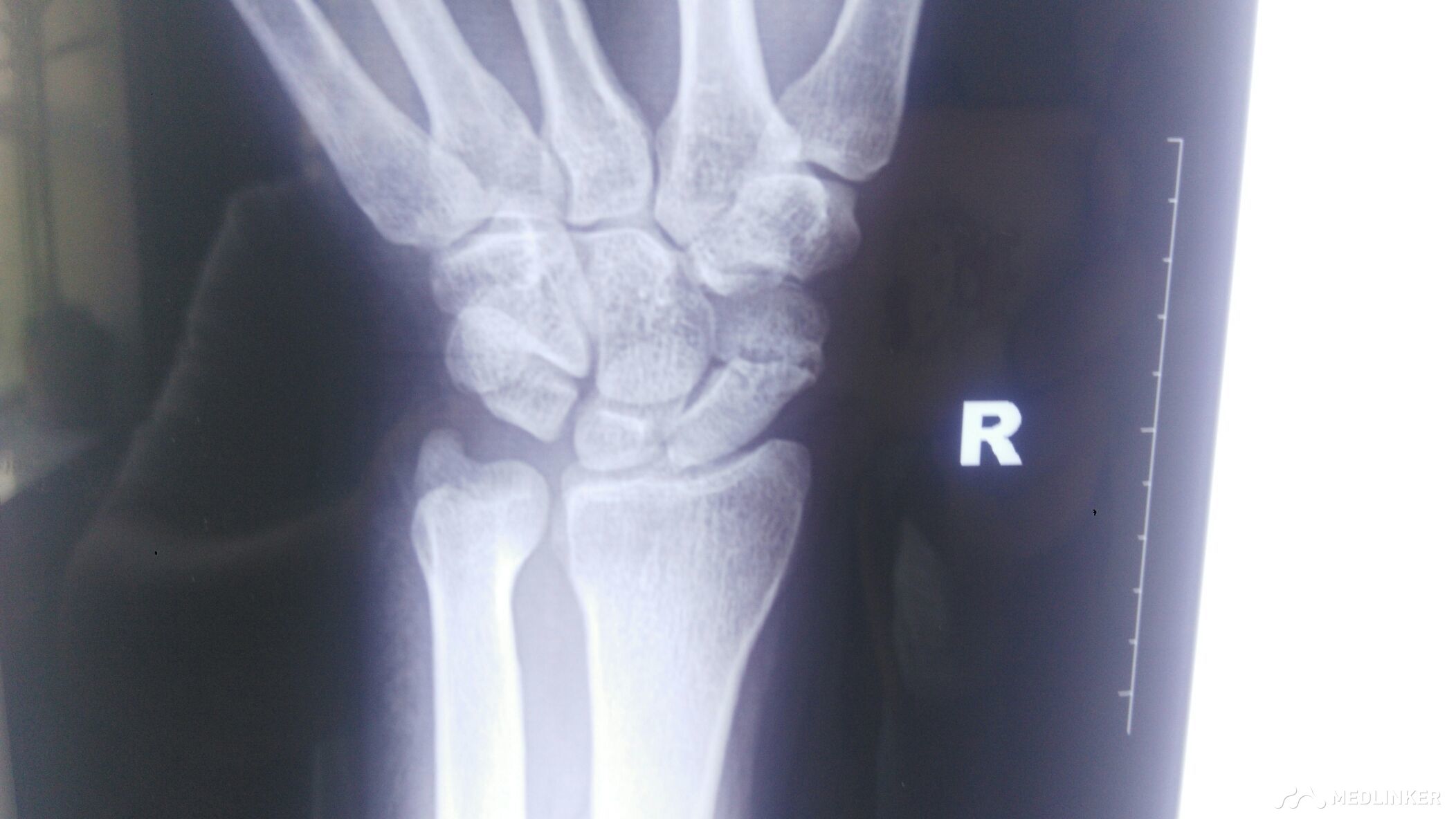 右腕部外伤后,未重视,未治疗。今日来拍片子。右侧腕关节活动受限伴疼痛。