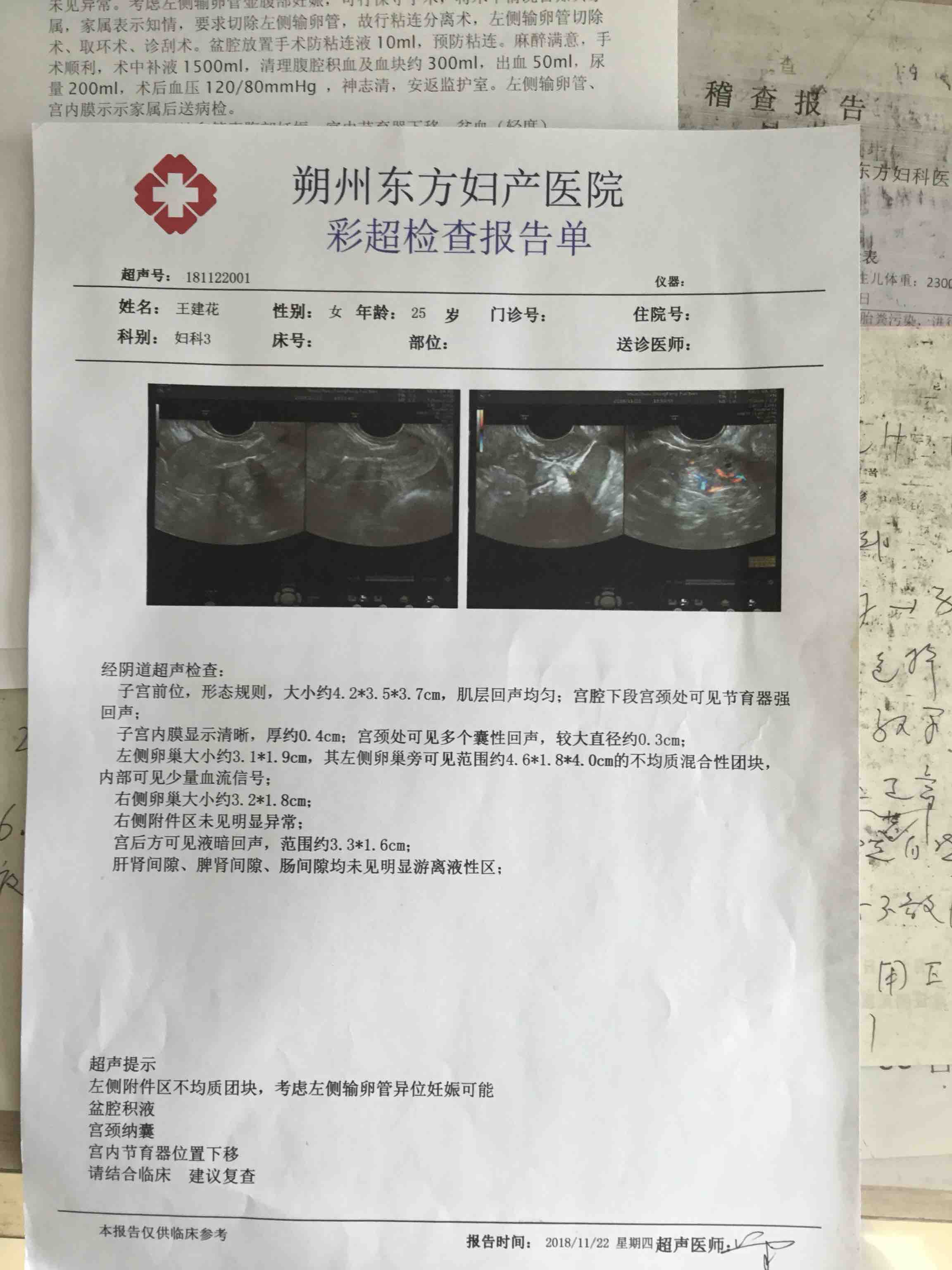 生命体征正常,心肺未闻及异常。妇科检查,外阴已产型,阴道畅,有少量暗红色血,宫颈光滑,子宫前位,8cmx6cmx5cm大小,质软,活动好 压痛,左侧附件区增厚压痛,右侧附件区未见异常。辅助检查,彩超,血hcg,如图