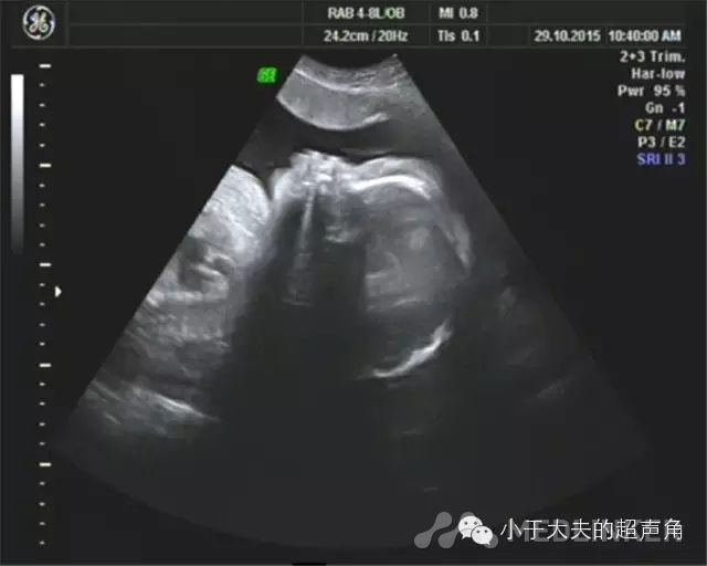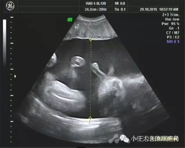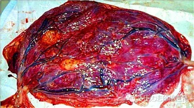 超声诊断双胎。A胎儿:臀位,孕相当于34周+1胎儿声像图异常改变,心胸比增大,腹腔积液,胎儿皮下水肿,S/D比值增高。(不除双胎输血综合征可能,建议产前咨询及进一步检查)B胎儿:头位,孕相当于32周,胎心偏快4行剖宫产术剖宫产术后确诊为:双胎输血综合征,胎盘中间有很多血管交通支,如下图:图5、双胎输血综合征,可见胎盘中间部分有很多血管相互交织成的血管网 TTTS需鉴别的疾病1、羊水过少&羊水过多:两个羊膜腔内羊水量存在差异并不少见,单凭羊水量差异不足以诊断TTTS。一个胎儿严重的羊水过少或过多,而另一个胎儿羊水正常,应高度怀疑双胎之一孤立性的胎儿异常或胎儿生长受限所致。2、不相称胎儿生长:不相称胎儿生长仅仅是一个征象,简单的是指两胎儿生长明显不同,或不相称胎儿发育异常。TTTS的特征为两个胎儿都经历着病理过程,因此两个胎儿都有异常的超声表现。
