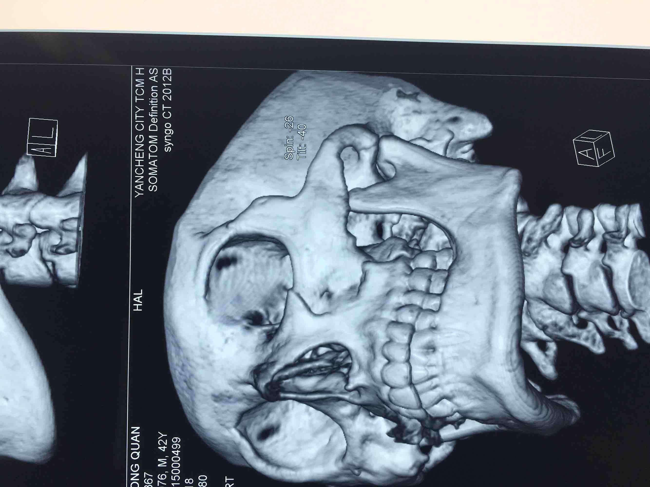 查体:左眼眶周青紫肿胀,球结膜下出血,眼球运动自如,有复视,左颧面部塌陷畸形,眶外侧缘及下缘可扪及台阶感,眶下区麻木感,左上和牙齿及上唇麻木感,张口度3.0cm咬合关系正常,上下颌骨无异常动度。辅查:颌骨CT:左颧骨复合体骨折(左眶外侧缘及眶下缘,颧牙槽嵴