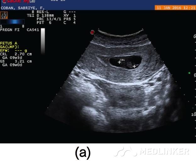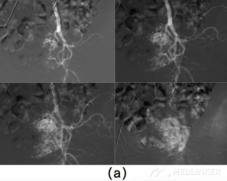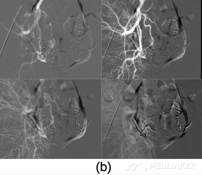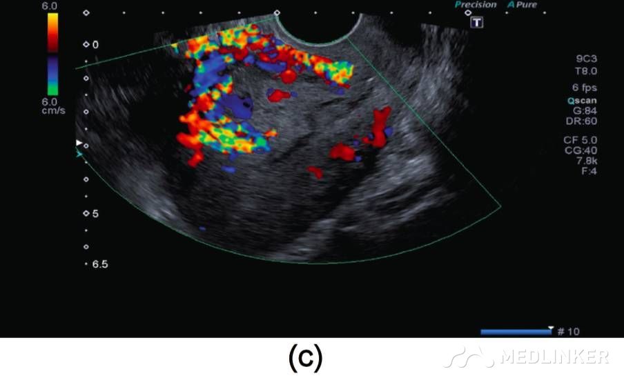 患者入院诊断:动静脉畸形。介入科会诊后行双侧子宫动脉栓塞术,栓塞材料为氰丙烯酸丁酯和碘油的混合物。该患者栓塞前后情况如图2所示。子宫动脉栓塞术后,患者未出现并发症,术后2天,患者出院,血hCG降至1766mIU/mL。术后1个月复查超声,未见血流,且受损范围缩小至61∗46∗52mm(77cm3)(图3),血hCG<0.5mIU/mL。  图2(a)右/左髂内子宫动脉造影术示:轻度扩张的子宫动脉显影浑浊,子宫内见多血管性肿块;(b)双侧子宫动脉栓塞术后图像   图3(a)2个月后的阴式超声示::受损范围缩小至61∗46∗52mm(77cm3);(b)多普勒彩超未见血流 根据年龄、生育要求、病变位置及范围大小选择不同的治疗方案,AVM主要的治疗方法是子宫切除和子宫动脉栓塞。育龄期有生育要求的子宫动静脉瘘患者首选治疗方法是子宫动脉栓塞,但是其远期的安全性尚存争议,而且行子宫动脉栓塞术后,妊娠的孕妇发生胎位异常、早产、产后出血及剖宫产的风险增大。 一些学者认为保守治疗适合无症状的AVM患者;还有学者认为出血少的AVM患者可以用甲基麦角新碱、促性腺激素释放激素类似物、达那唑等治疗。总之,目前对无症状的子宫动静脉瘘的治疗暂无统一的共识。 总之,子宫动静脉瘘是比较罕见且危险的临床疾病。通常,这种疾病常见于既往发生过自然流产的年轻女性,我们应该牢记行人工流产术(吸宮术)的患者,术后可能会继发子宫动静脉瘘,同时应该注意该病与其他疾病的鉴别。