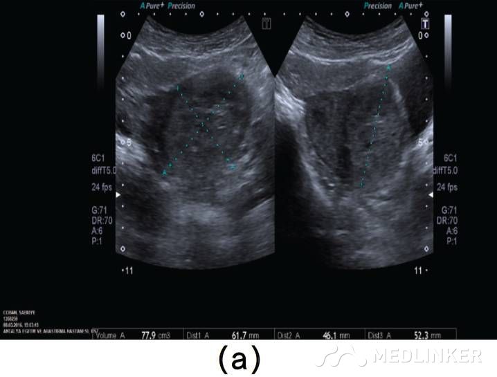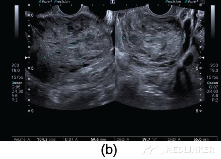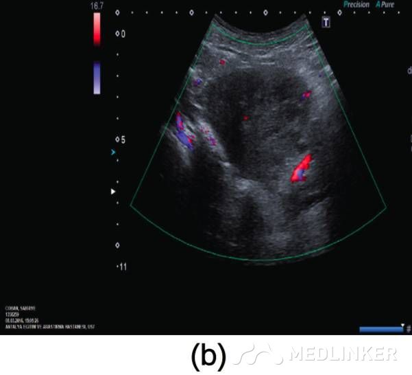患者35岁,G2P1A1,2周前因稽留流产(9周),于外院行刮宫术(图1a)。该患在首次刮宫术后因怀疑宫腔内血肿,在术后观察的一周内反复性刮宫。最终因为患者阴道流血及转入我院后,终止刮宫。入院后查:Hb:11.2g/dL,Htc:35.1%,hCG:3518mIU/mL。阴式超声示子宫前壁可见60×60×56mm(103cm3)大小杂乱回声区(图1b)
