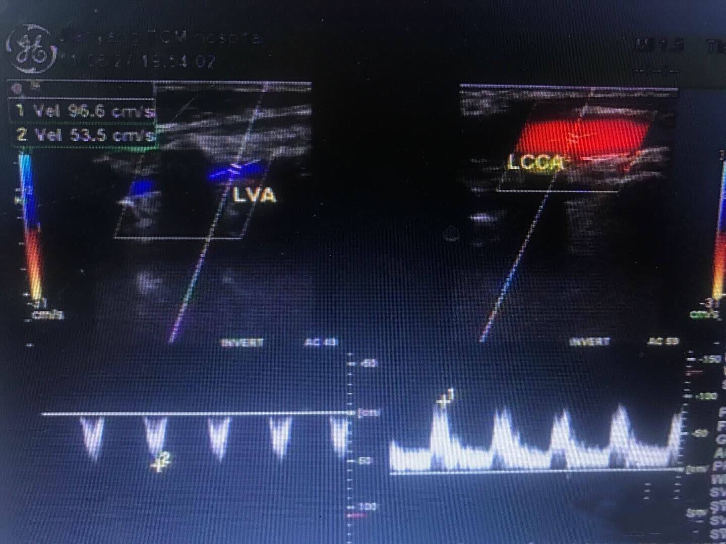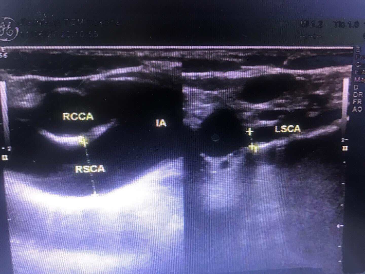 左侧桡动脉血流频谱,为低阻单相波形。左侧椎动脉和左侧颈总动脉血流,二者血流方向相反。 右侧和左侧锁骨下动脉起始部,左侧明显较右侧管径细。