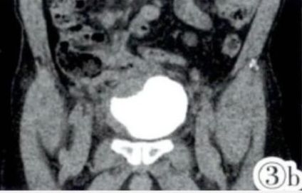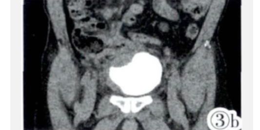 图3a,3b CTU重组示受累回肠与膀胱紧密相连,膀胱右侧壁、膀胱底受压变形。