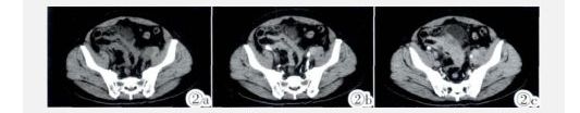 图2a~2c 回肠壁不均匀增厚,厚约1.35 cm,平扫CT值约38HU,增强扫描可见轻度强化,CT值约为60HU,周围脂肪间隙模糊、密度增高,受累回肠与膀胱病变分界不清。