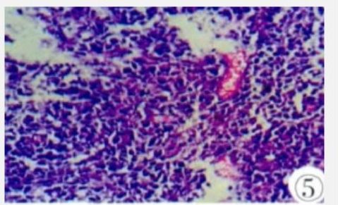 手术及病理所见:在全麻下行膀胱镜检,膀胱镜示:膀胱右侧壁黏膜面不光滑,可见双侧输尿管开口正常并喷尿。行经尿道离子束刀膀胱肿瘤切除术。术后病理回报:巨检:灰白相间灰黄色碎组织,大小共2mm×2mm×3mm;镜下:大量大小较一致的异型细胞,排列密集,细胞核圆形或卵圆形、泡状,核仁明显,2~4个靠近核膜,胞质较少,嗜双色或嗜碱性,可见核分裂,并见多灶性不规则坏死灶(图5)。