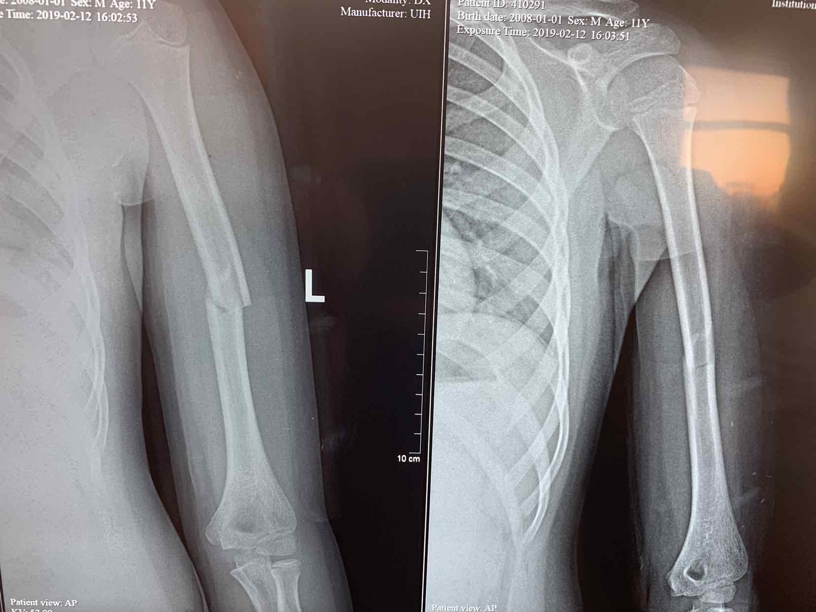 车撞伤,左侧上臂肿痛,畸形,活动受限一小时。患者于一小时前在玩耍时被机动车撞伤,当即左侧上臂肿痛。畸形,不敢活动,立即来诊,门诊拍片提示,左侧肱骨中段骨折,断端移位,对位欠佳。门诊以巡测肱骨骨折收入院治疗。