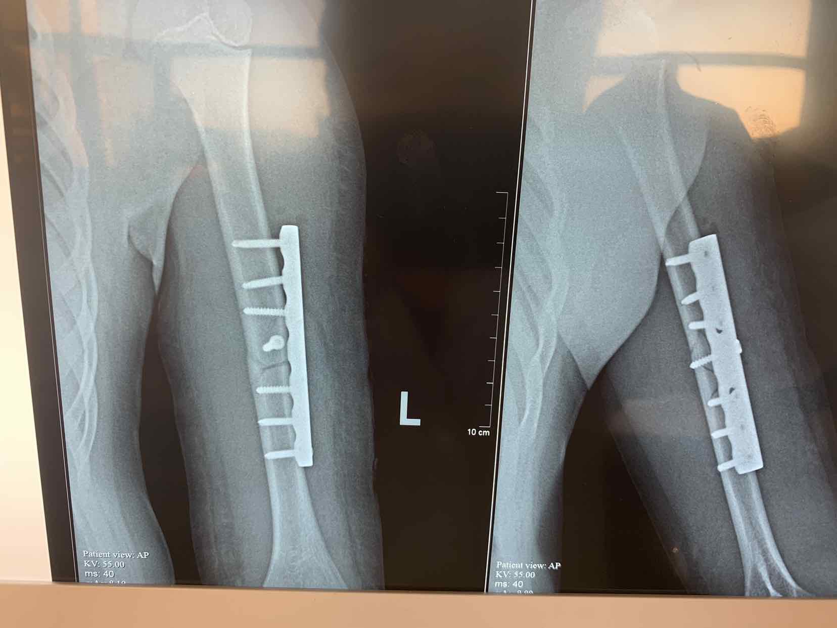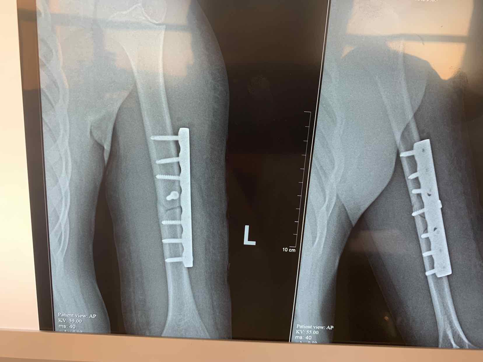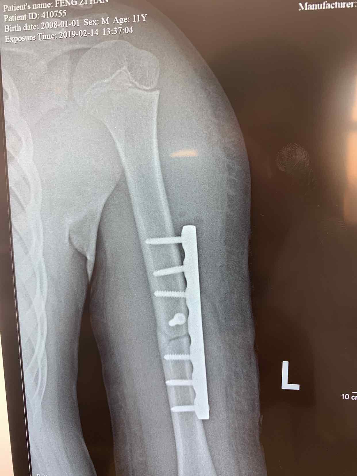 诊断为左侧肱骨中段骨折。全麻下行切开复位内固定术。术中局部应用拉力螺钉固定骨折端,安放六孔锁定钢板内固定,效果不错。术后早期就可以活动了。