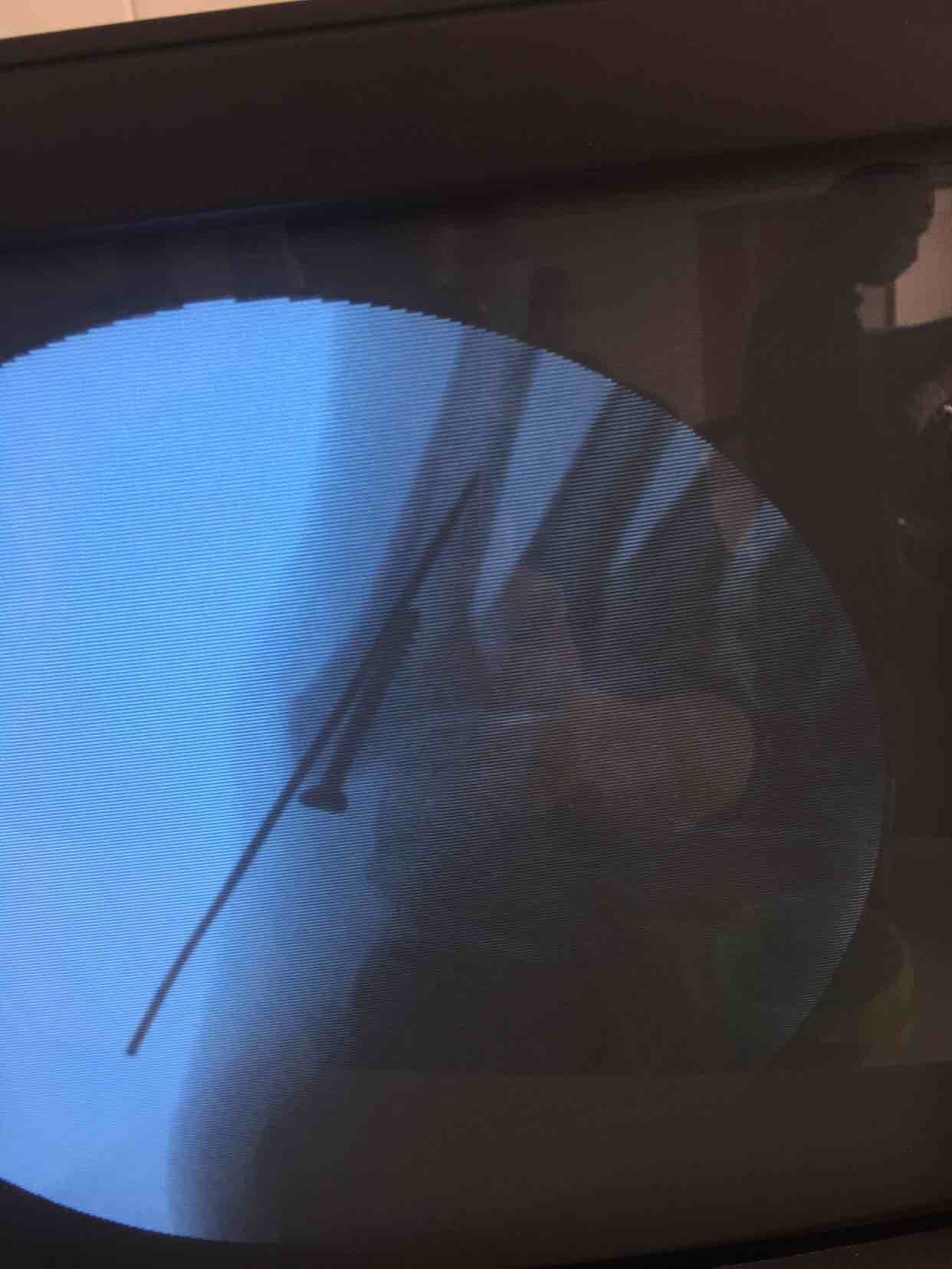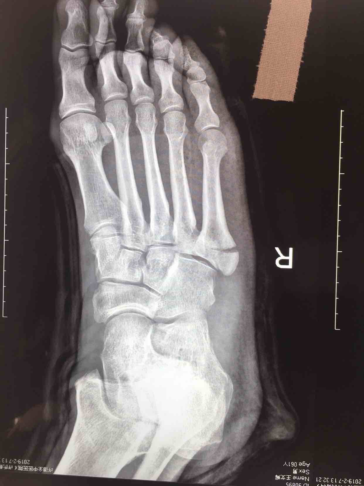 诊断第五跖骨基底部骨折(右)完善术前检查,在腰麻下行切复内固定术,术后抗炎,消肿等对症处理。