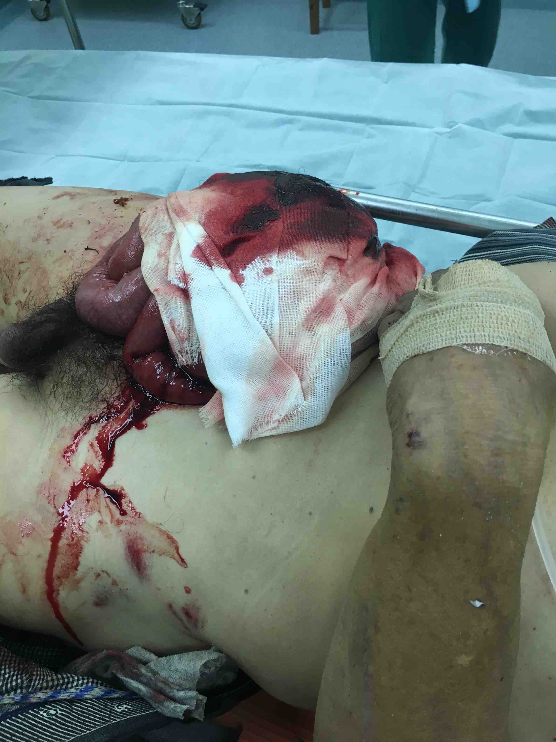 腹部及胸部外伤伴疼痛出血1小时1小时前,患者不慎被车撞伤胸部及腹部,当时无昏迷,胸闷胸腹部疼痛,腹部肠管脱出,急来诊,入住费县第二医院外一科治疗。