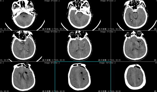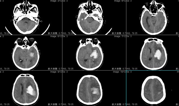患者陈XX,男性,59岁,主因“突发右侧肢体无力伴言语含糊1小时余”入院;头CT检查显示左侧基底节区脑出血多田公式计算出血量约80ml;手术入路:神经内镜辅助经左额脑出血清除术。