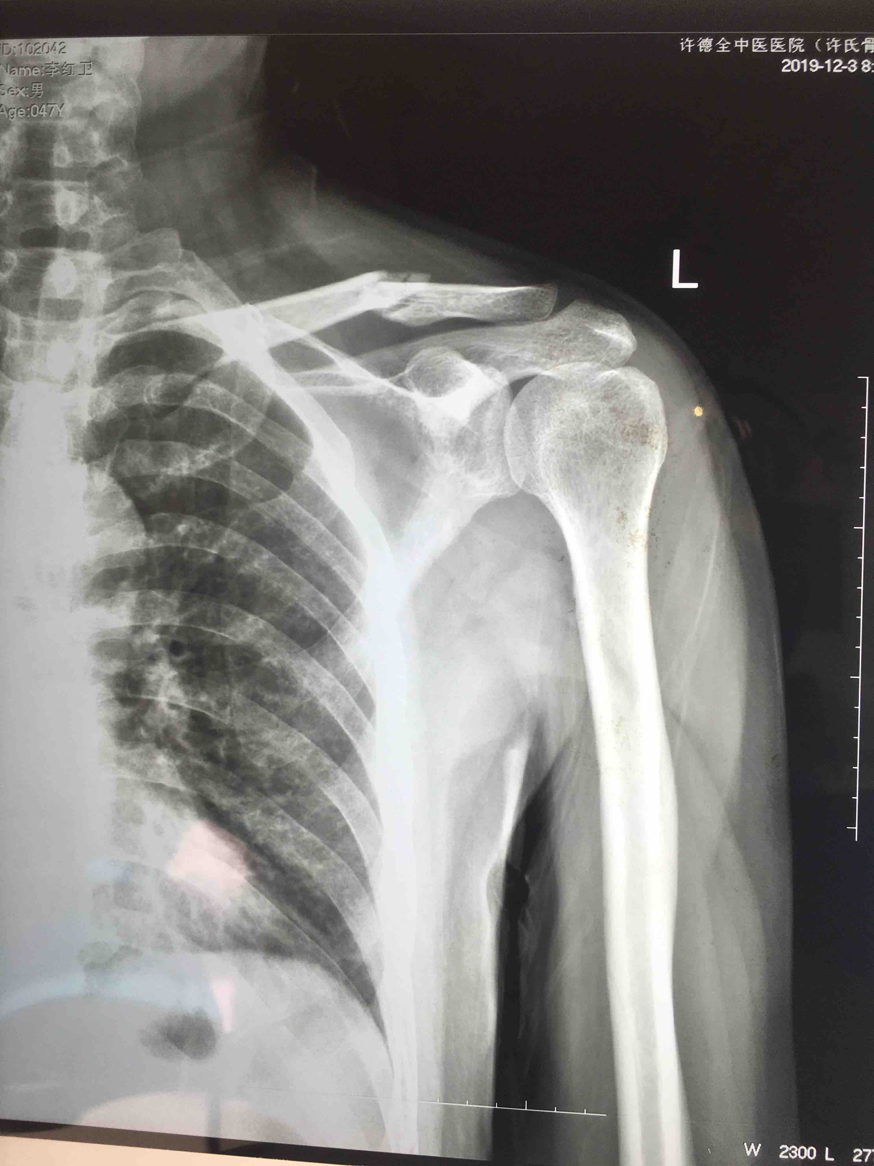 生命体征平稳,心肺复未见异常。左肩部皮色皮温正常,压痛及纵向叩击痛阳性,肩关节活动受限,末梢血运感觉正常。