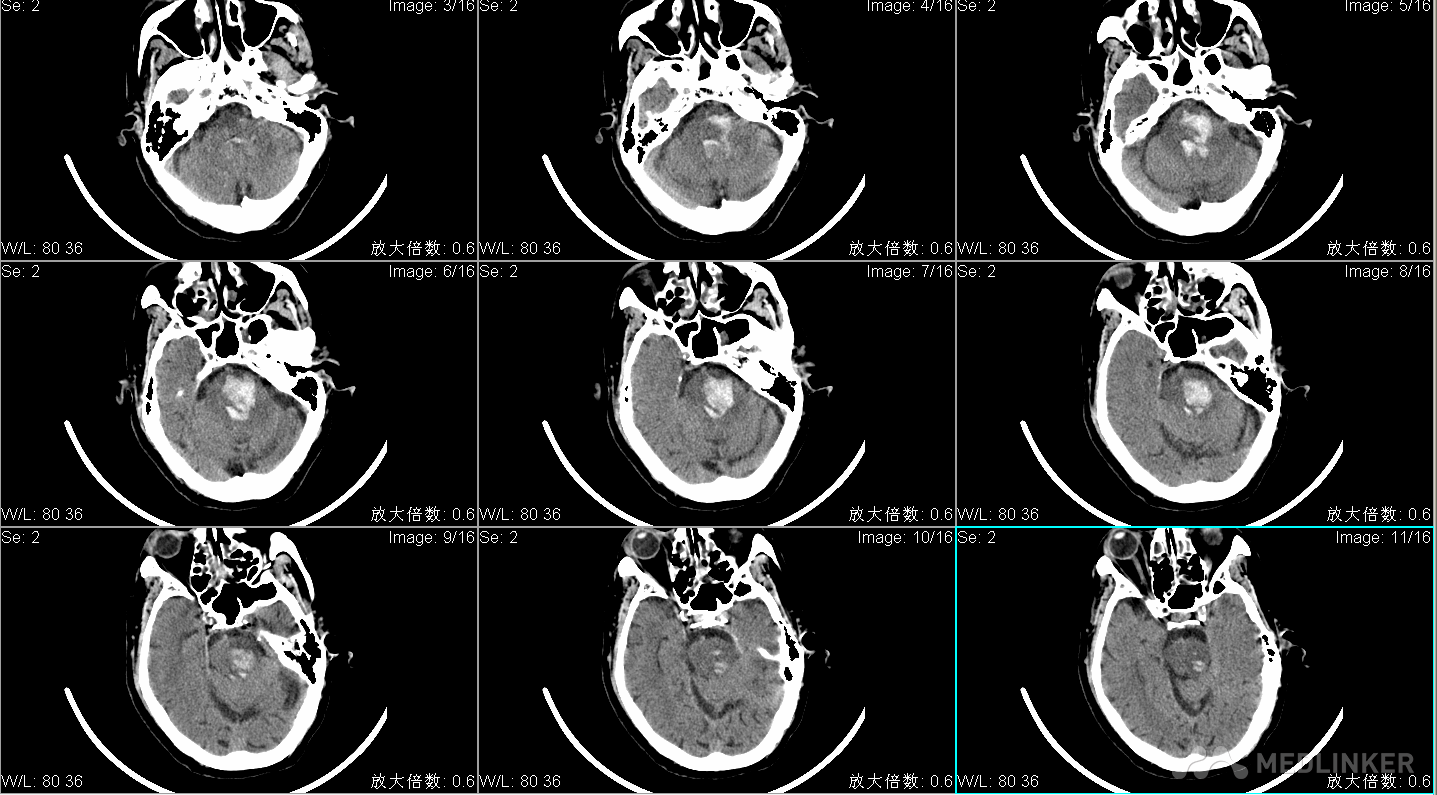 昏迷状态,刺痛不睁眼,无发声,四肢刺痛屈曲 ,GCS5分,双侧瞳孔直径左:右=1:1mm,光反射消失,眼球居中位,额纹对称,颈软,四肢刺痛屈曲,肌张力不高,腱反射(++),生理反射存在,双巴氏征(+)。 头CT显示脑干出血破入第四脑室,出血量约10ml。